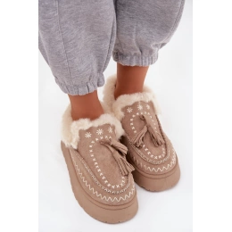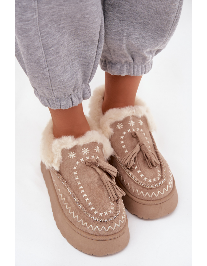 Béžové dámské sněhule Ferayne s pohodlnou platformou, měkkým vnitřním zateplením a kožešinou. Stylové třásně dodávají botám módní výraz a boční zip umožňuje snadné nazouvání. Robustní podrážka zajišťuje stabilní chůzi i na kluzkém povrchu. Ideální volba pro zimní městské i volnočasové outfity.