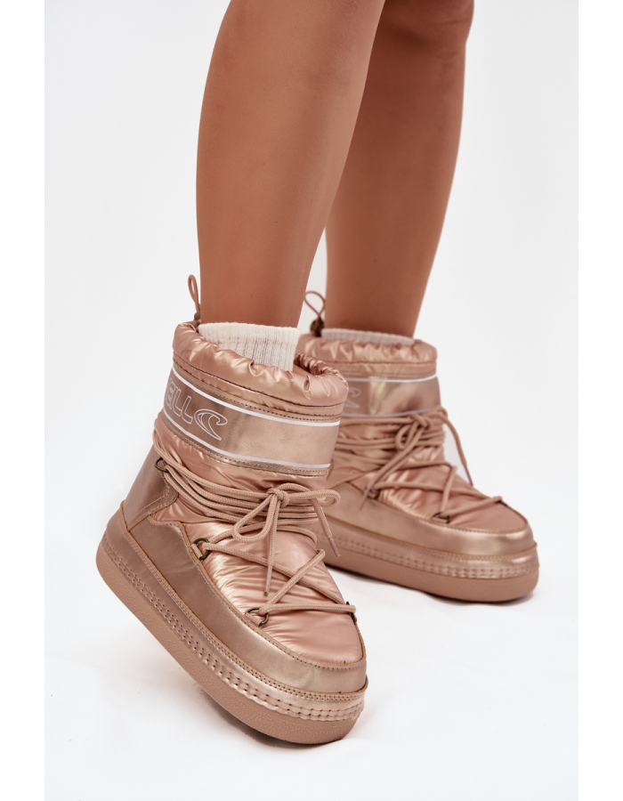 Zlaté dámské sněhule O’Neill Lisa High s měkkým vnitřním zateplením („kožíšek“), které zajišťuje pohodlí a teplo během zimních dní. Boty kombinují design „slip‑on“ s klasickým šněrováním, díky čemuž se dají pohodlně nazout a zároveň dobře přizpůsobit noze. Platformová podrážka (cca 2 cm) a robustní konstrukce poskytují stabilitu na sněhu a izolaci od chladu.