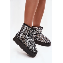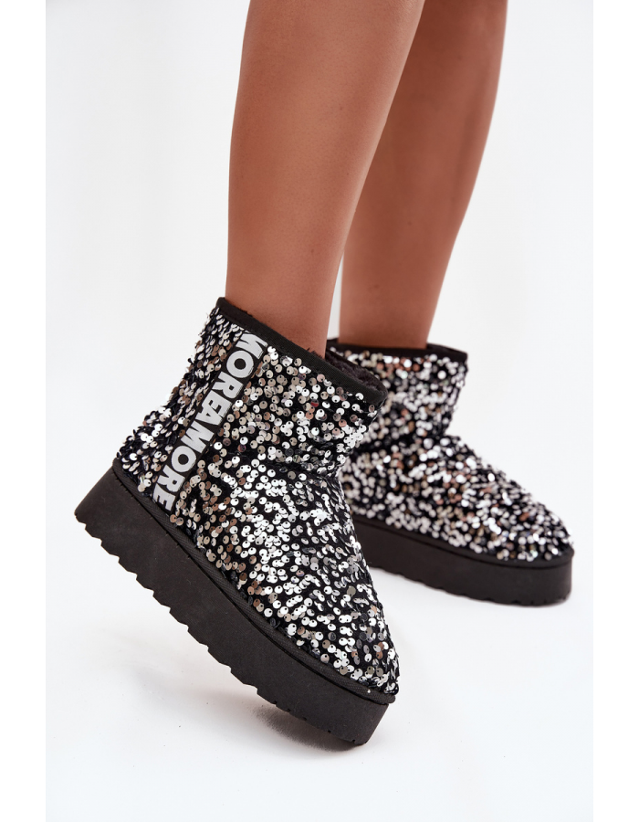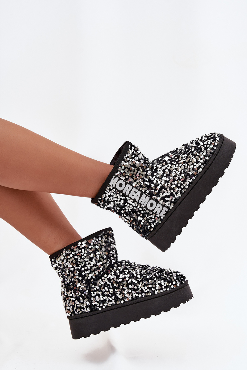 Stylové dámské sněhule Silmo v černo-stříbrném provedení, zdobené flitry, které přitahují pohled. Uvnitř je měkké syntetické pro optimální tepelnou izolaci. Model je osazený na robustní gumové platformě, která izoluje chodidlo od chladného podloží. Střih sahá nad kotník a vytváří módní, ale i funkční zimní siluetu.