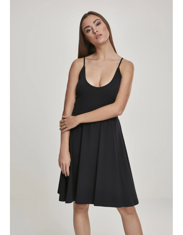 Moderní a ženské, tyto špagetové šaty tvoří skvělou siluetu a udrží vás bez potu i v horkých dnech! Kulatý hluboký výstřih hezky kontrastuje se sportovními ramínky a širokými průramky vzadu. Bavlněné šaty ležérně padají po těle a končí nad koleny. Dokonalé šaty pro vychutnání každého letního dne.