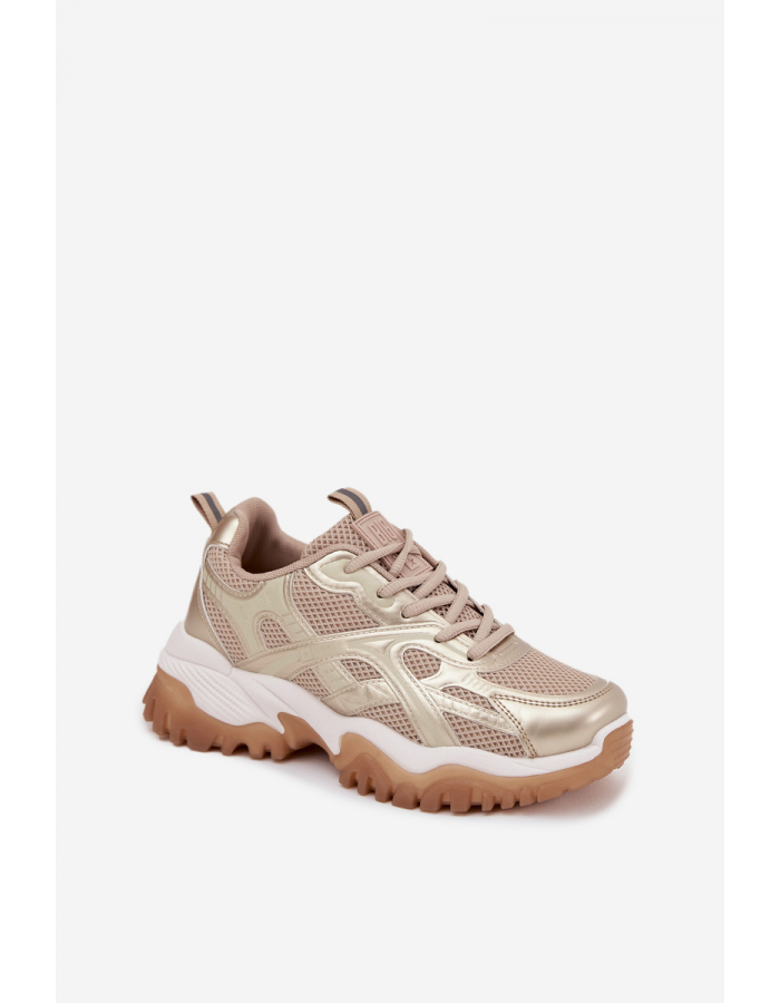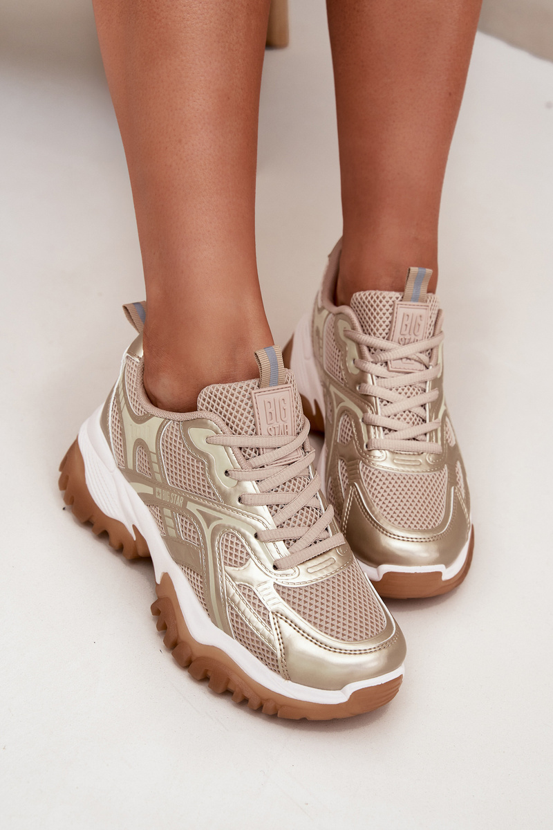 Moderní sneakersy Big Star v elegantní béžovo-zlaté kombinaci spojují módní vzhled s pokročilou funkčností. Díky technologii HI-POLY SYSTEM poskytují vynikající odpružení a pohodlí i při celodenním nošení. Měkký textilní svršek v kombinaci se syntetickými detaily zajistí prodyšnost a podporu chodidla. Masivnější podrážka ve sportovním stylu dodává botám stabilitu a zároveň lichotí postavě.