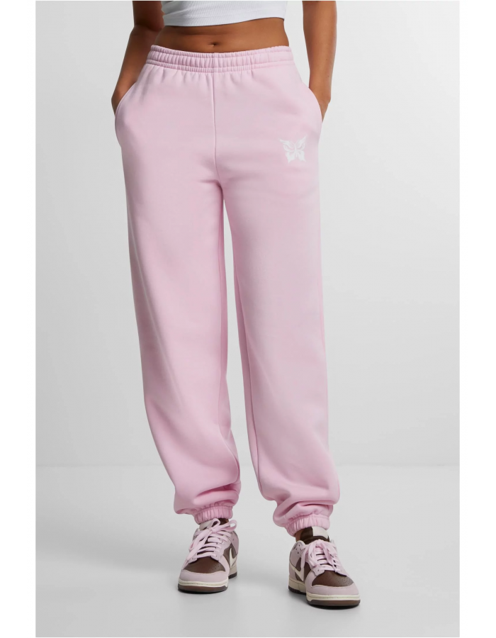 Tepláky s elastickým pasem a volnějším střihem. Na levé straně je malý bílý motiv motýla, který dodává jemný a stylový detail. Spodní lem tepláků má elastické manžety, které zajišťují pohodlné nošení a udržují tepláky na místě. Tento kousek je ideální pro volnočasové aktivity, sport nebo neformální nošení a poskytuje jak pohodlí, tak styl.