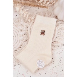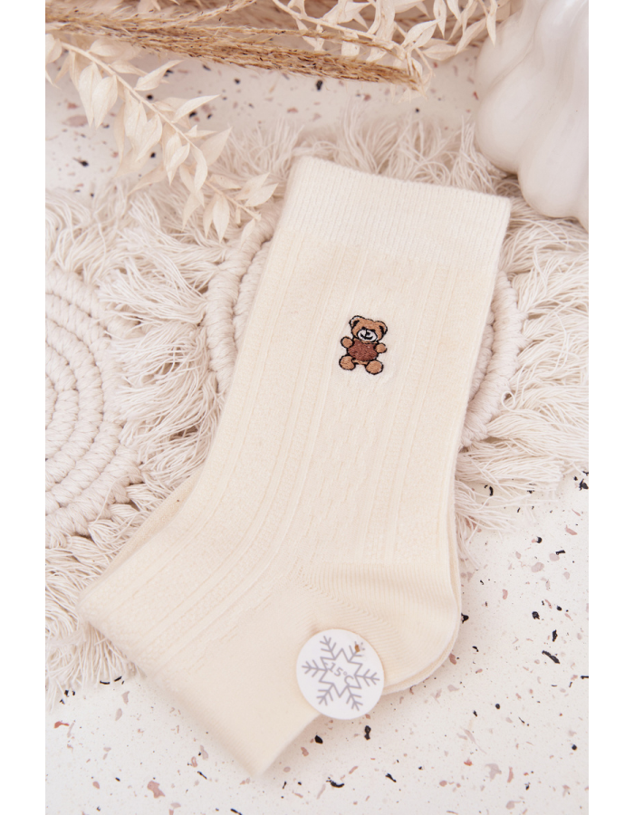 Hřejivé dámské ponožky s motivem medvídka v ecru provedení jsou ideální pro chladné dny. Ponožky jsou vyrobeny s příměsí vlny, která zajišťuje tepelný komfort a měkkost. Elastický lem udržuje ponožky na místě bez škrcení, zatímco příjemný materiál poskytuje pohodlí během celého dne. Veselý motiv medvídka dodává ponožkám hravý a útulný vzhled.