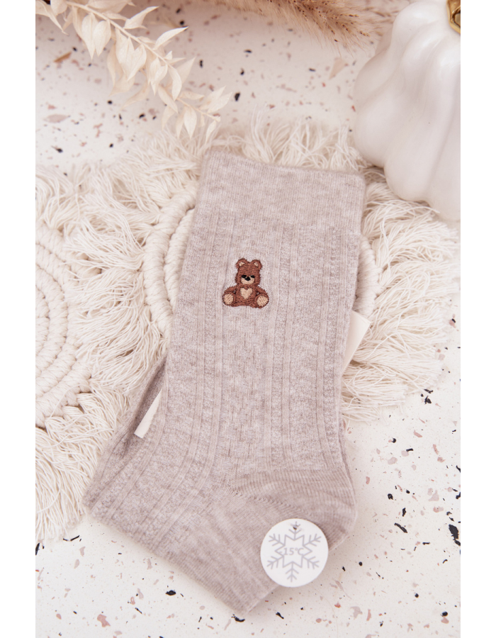 Hřejivé dámské ponožky s motivem medvídka v šedém provedení jsou ideální pro chladné dny. Ponožky jsou vyrobeny s příměsí vlny, která zajišťuje tepelný komfort a měkkost. Elastický lem udržuje ponožky na místě bez škrcení, zatímco příjemný materiál poskytuje pohodlí během celého dne. Veselý motiv medvídka dodává ponožkám hravý a útulný vzhled.