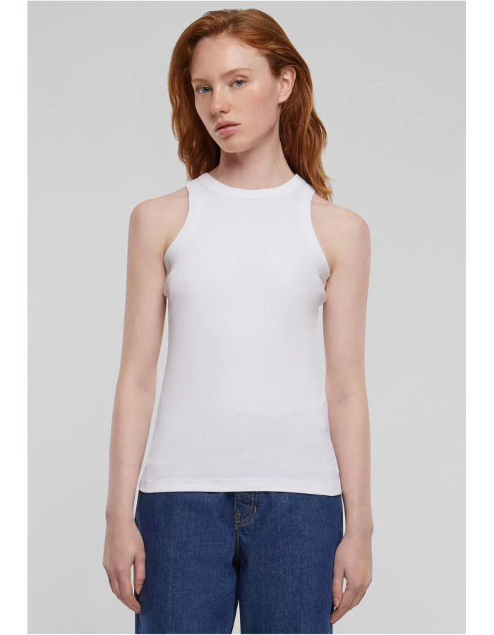 Tento top se vyznačuje dynamickým racerback designem a nabízí siluetu obepínající tělo. Vyrobeno ze směsi 95% bavlny a 5% elastanu, slibuje pohodlí a perfektní střih. Žebrovaná textura a žebrované manžety a výstřih dodávají topu další módní nádech. Ideální pro sportovní aktivity nebo jako součást uvolněného volnočasového outfitu, tento top nabízí funkčnost a styl v jednom.ne.
