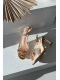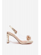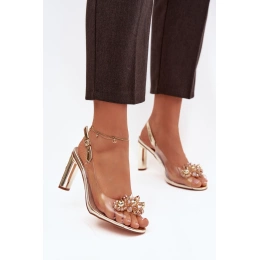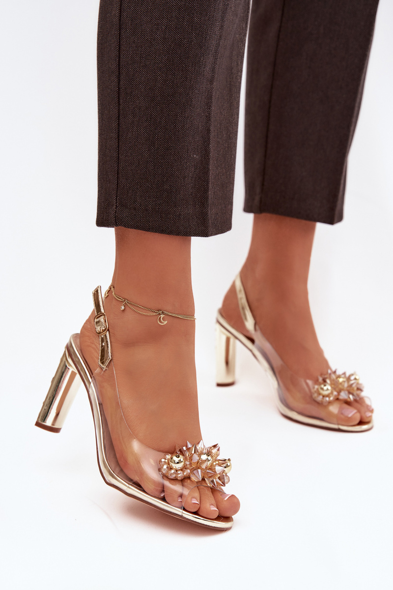 Zlaté transparentní sandály na sloupku skvěle doplní společenské šaty i elegantní kalhotový outfit a dodají mu jemný třpyt.
