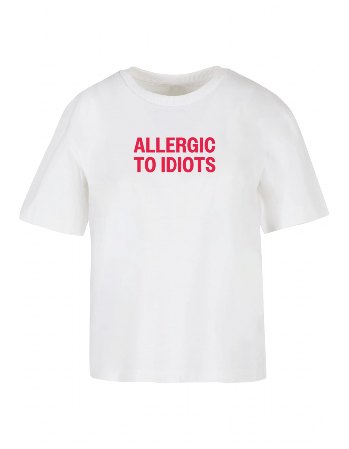 Toto tričko s krátkým rukávem má jednoduchý, ale výrazný potisk s nápisem „ALLERGIC TO IDIOTS“ v červené barvě na přední straně. Tričko má klasický střih s kulatým výstřihem, který poskytuje pohodlí pro každodenní nošení. Design je moderní a sarkastický, což z něj dělá ideální volbu pro ty, kteří chtějí vyjádřit svůj vtipný a ironický postoj.