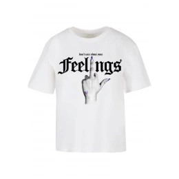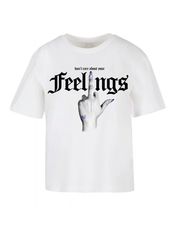 Toto tričko má výrazný design. Uprostřed je vyobrazená ruka, která ukazuje prostředníček. Prst má nalakované nehty fialovou barvou a na zápěstí je malé fialové srdce. Nad rukou je velký nápis v gotickém stylu: "Feelings", přičemž menší text nad tím zní: "don't care about your". Celkově tričko působí provokativně a vyjadřuje postoj nezájmu o city druhých.
