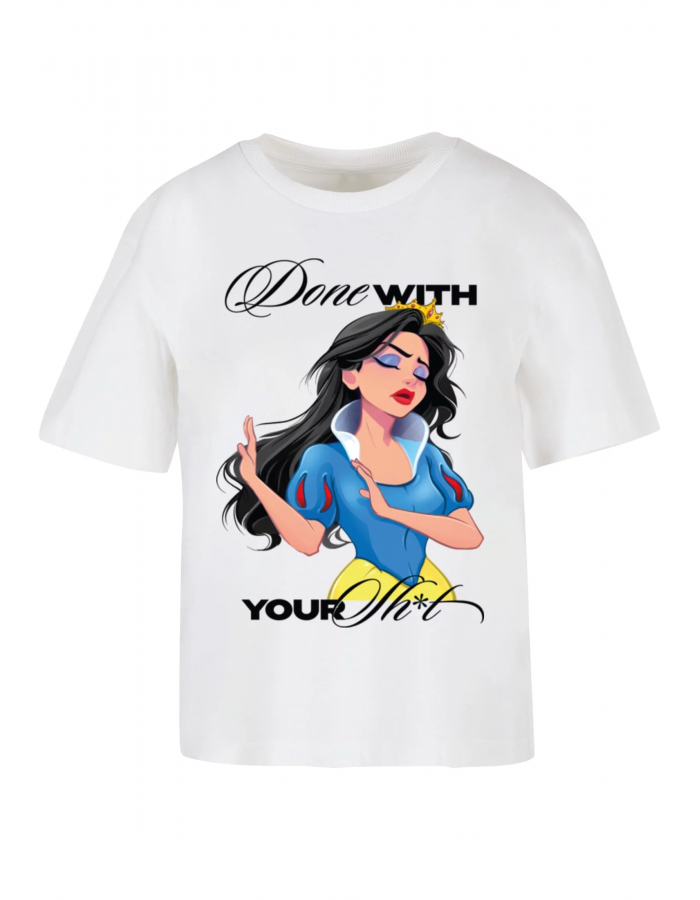 Toto tričko má výrazný a sarkastický design, který na přední straně zobrazuje upravenou verzi známé pohádkové postavy v moderním stylu. Postava má uzavřené oči a odtažené ruce, jako by se bránila něčemu nepříjemnému, a nad ní je nápis „Done with your sh*t“ (což lze volně přeložit jako „Mám dost tvých keců“), přičemž poslední slovo je částečně cenzurováno symbolem hvězdičky. Tento design vyjadřuje postoj a sebevědomí a je vhodný pro ty, kteří se chtějí odlišit a ukázat svůj osobitý smysl pro humor a styl.