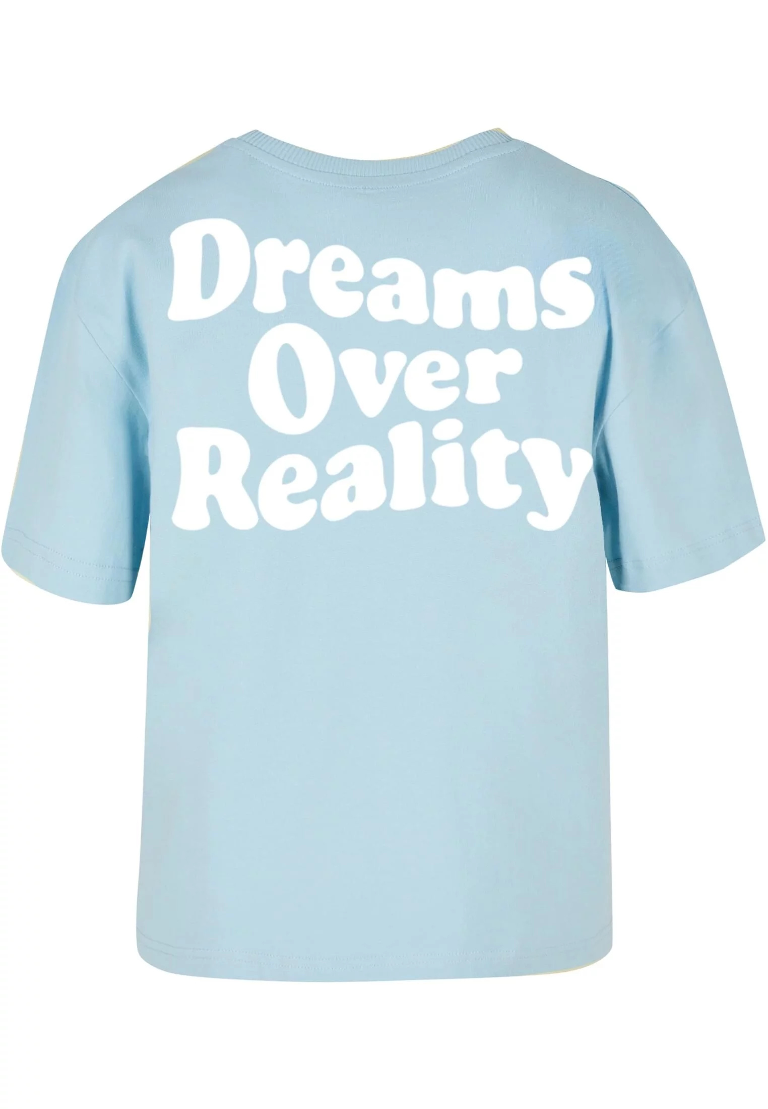 Toto tričko má na přední straně jednoduchý nápis „Dreams Over Reality“ umístěný v levé horní části. Na zadní straně trička je stejný nápis „Dreams Over Reality“ ve větším formátu, což vytváří sjednocený a přitom poutavý design. Velký, bílý text na modrém podkladu vytváří jasný kontrast a zvýrazňuje optimistické poselství, které podporuje sny a fantazii nad každodenní realitou.
