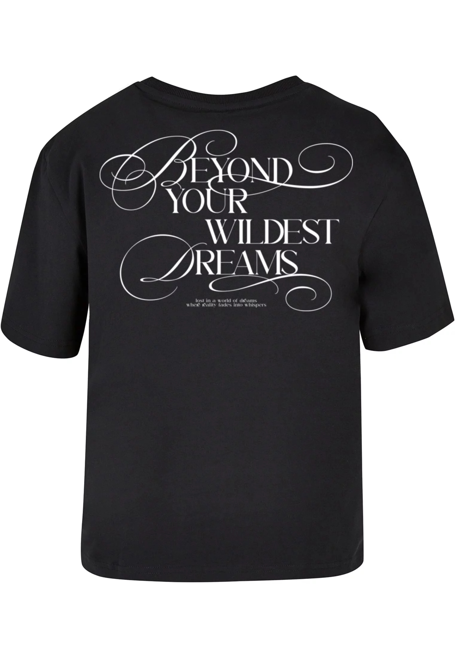 Na zadní straně trička je výrazný nápis „BEYOND YOUR WILDEST DREAMS“ ve velkém, zdobeném písmu, které přitahuje pozornost. Pod tímto hlavním textem se nachází menší text, který zní: „Lost in a world of dreams where reality fades into whispers“ — tedy v překladu „Ztracen v říši snů, kde se realita mění v šepot“.