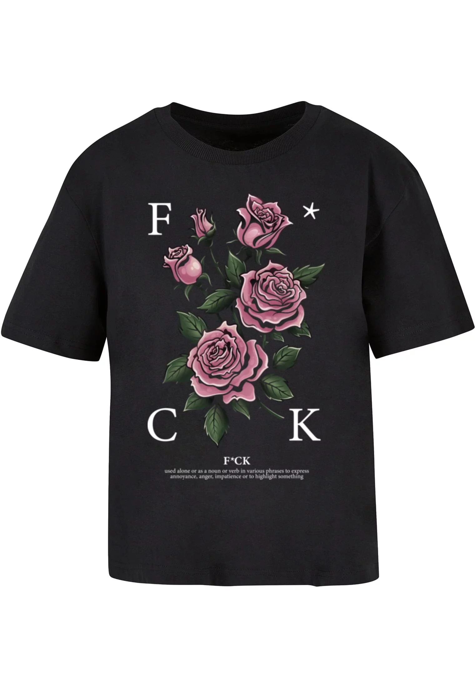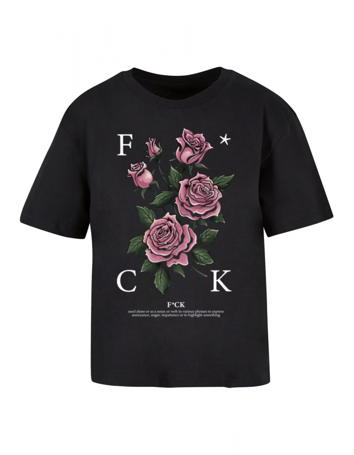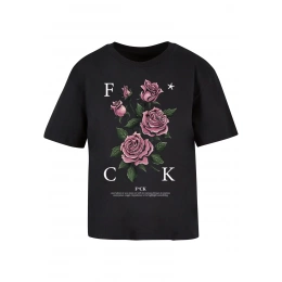 Toto tričko má výrazný a provokativní design. Na přední straně je nápis „F*CK“, kde jsou jednotlivá písmena rozmístěna kolem středu, který je zdoben růžemi.