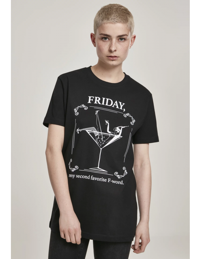 Toto legendární tričko trumfuje vtipem a stylem. Na truhle najdete koktejlovou sklenici, ve které se povaluje dáma. Kolem uzavírá jemně zdobený rám. Nad ním jsou slova „Pátek“ včetně „mého druhého oblíbeného F-slova.„No, necháme vás hádat, co by to mohlo být za slovo!Poznámka: Střih tohoto produktu je přizpůsoben trendu oversize