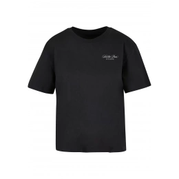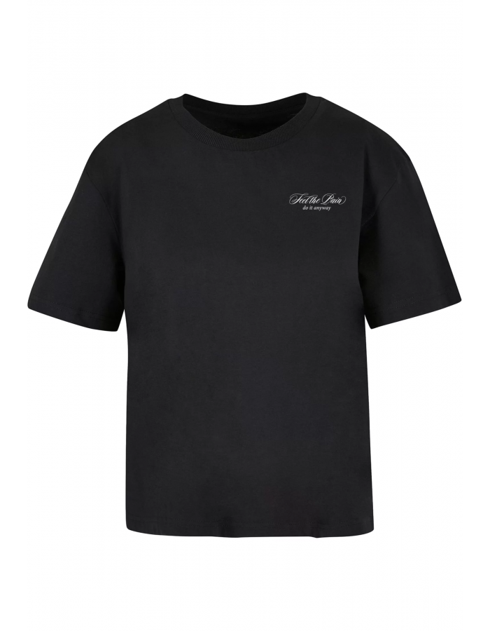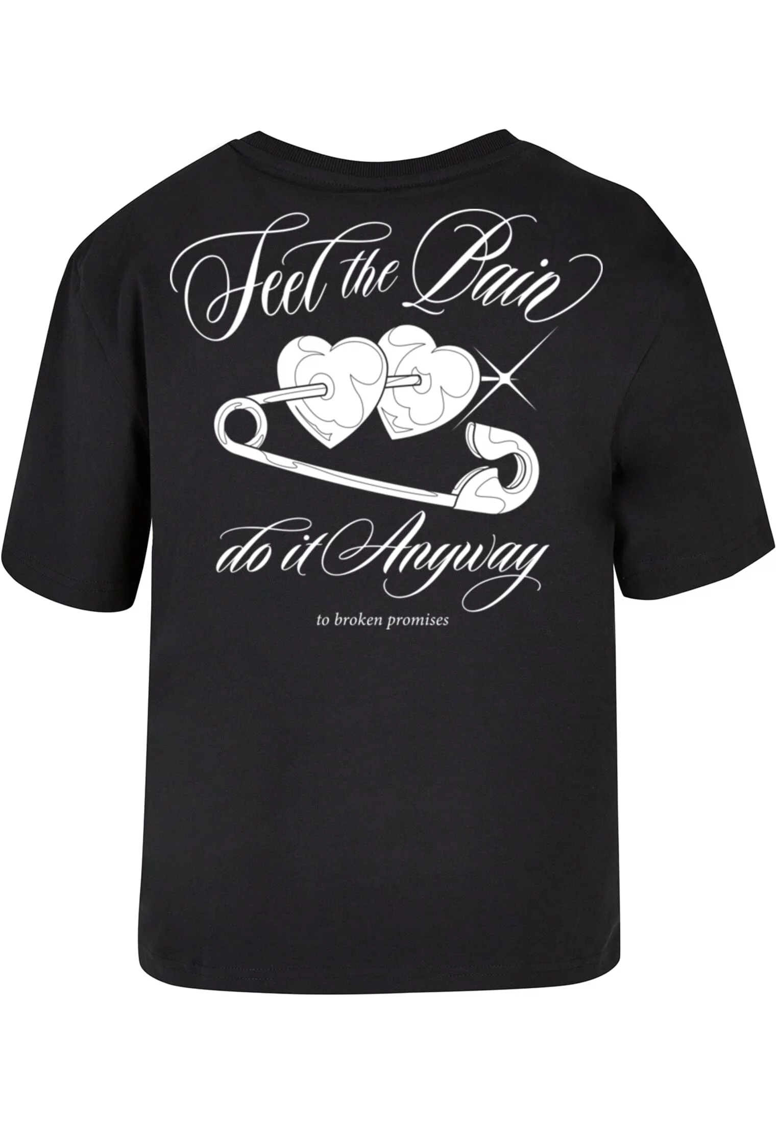 Na zadní straně trička je větší, výraznější design. Hlavní nápis zní „Feel the Pain, do it Anyway“ a pod ním je zobrazen špendlík, který propichuje dva srdce, což symbolizuje zlomené srdce nebo bolest. Pod tímto grafickým prvkem se nachází malý text „to broken promises“ — tedy „k porušeným slibům“.