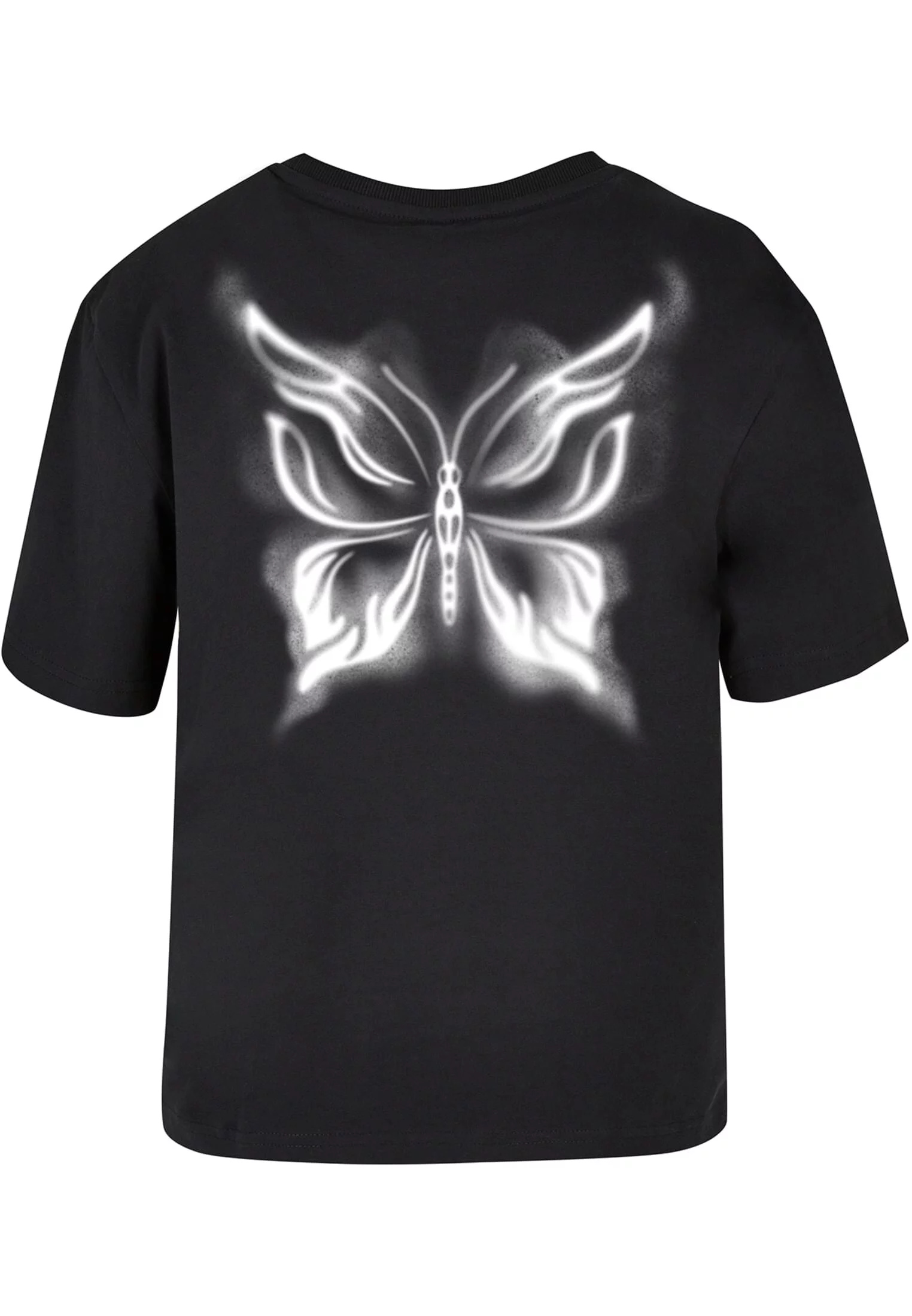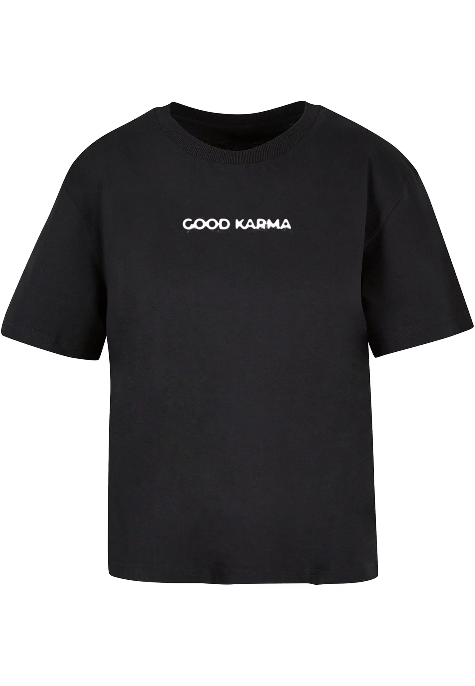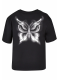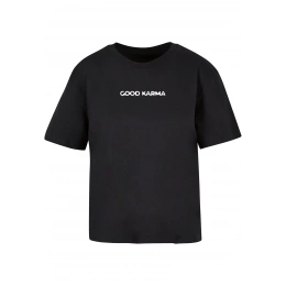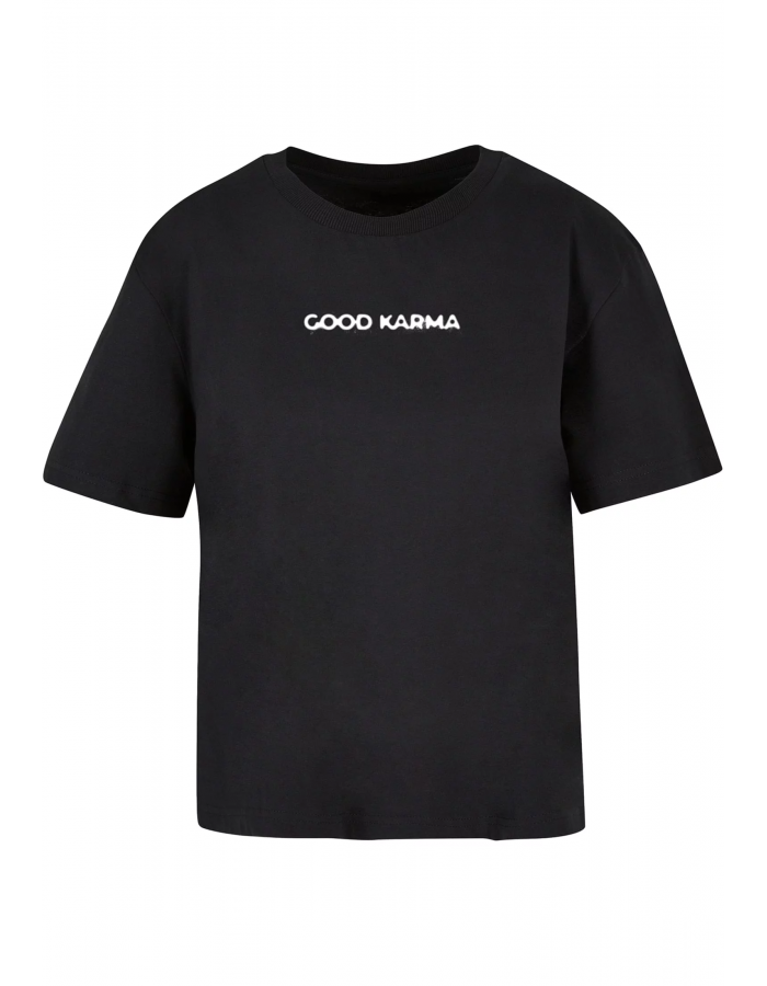 Tričko má na přední straně jednoduchý bílý nápis „GOOD KARMA“ ve středu hrudi. Na zadní straně trička je velká stylizovaná bílá kresba motýla. Motýl je vytvořen jemnými, kouřovými tahy, což dodává designu éterický a snový dojem. Tento motiv symbolizuje transformaci a pozitivní energii, což koresponduje s tématem dobré karmy.