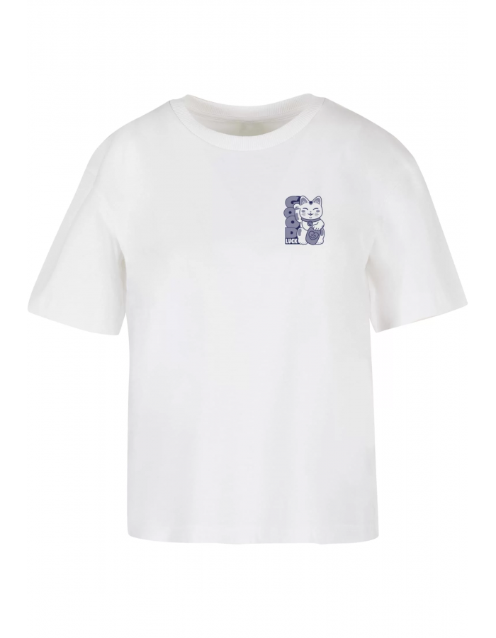 Tričko s krátkým rukávem. Na přední straně se nachází menší potisk zobrazující kočku štěstí, známou jako Maneki Neko, spolu s nápisem „Good Luck“ v modro-fialových barvách. Zadní strana trička je výrazně zdobená barevným potiskem, který kombinuje různé japonské motivy, jako je Maneki Neko, sakurové květy, duha, nápisy jako „Kawaii Dream“ a další popkulturní symboly spojené s japonskou kulturou. Tričko působí hravě a stylově, je vhodné pro ty, kteří mají rádi originální a výrazné designy inspirované Japonskem.