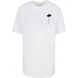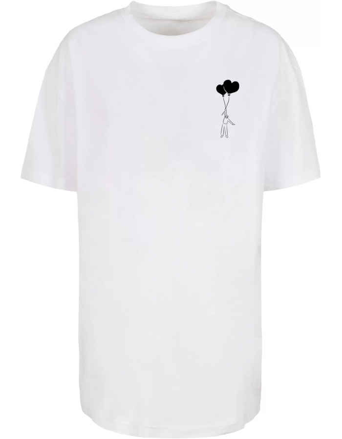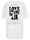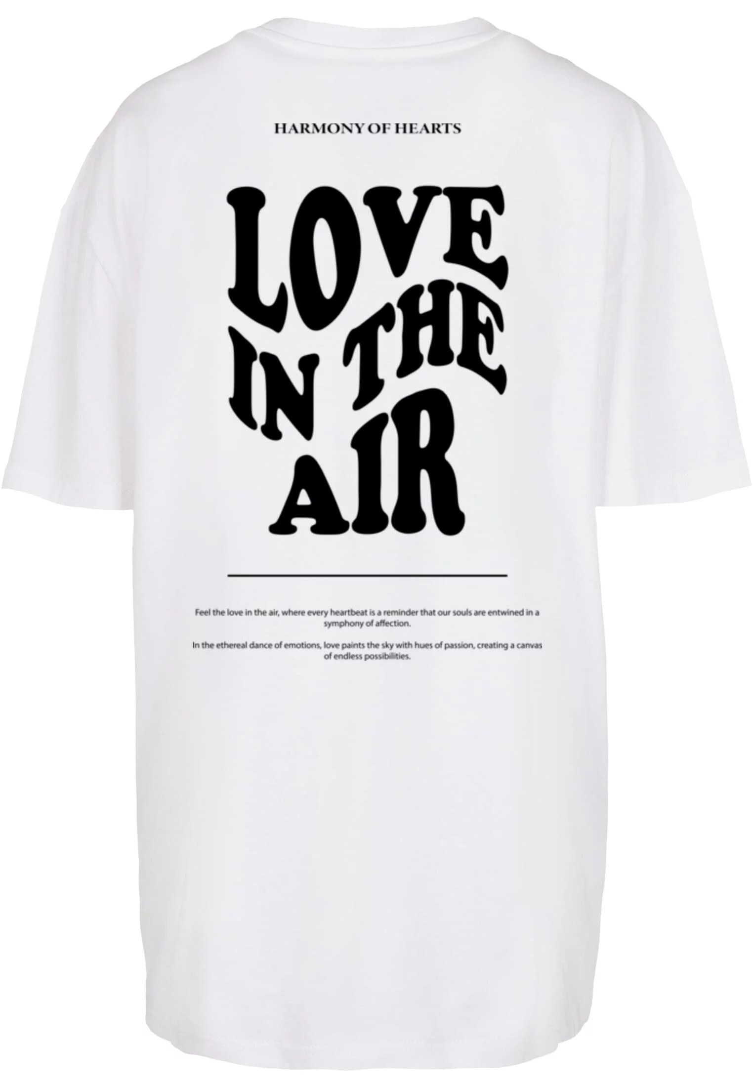 Na přední straně, v oblasti hrudi, je malý černý obrázek postavy, která se drží dvou černých balónků ve tvaru srdcí, což vytváří jednoduchý a hravý design. Na zadní straně trička je velký černý nápis „LOVE IN THE AIR“ ve výrazném, ozdobném písmu. Nad tímto nápisem je menší text „HARMONY OF HEARTS“. Pod hlavním nápisem je další menší text, který poeticky popisuje lásku jako součást života. Tričko je jednoduché, ale se silným vizuálním a emocionálním sdělením.