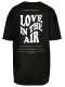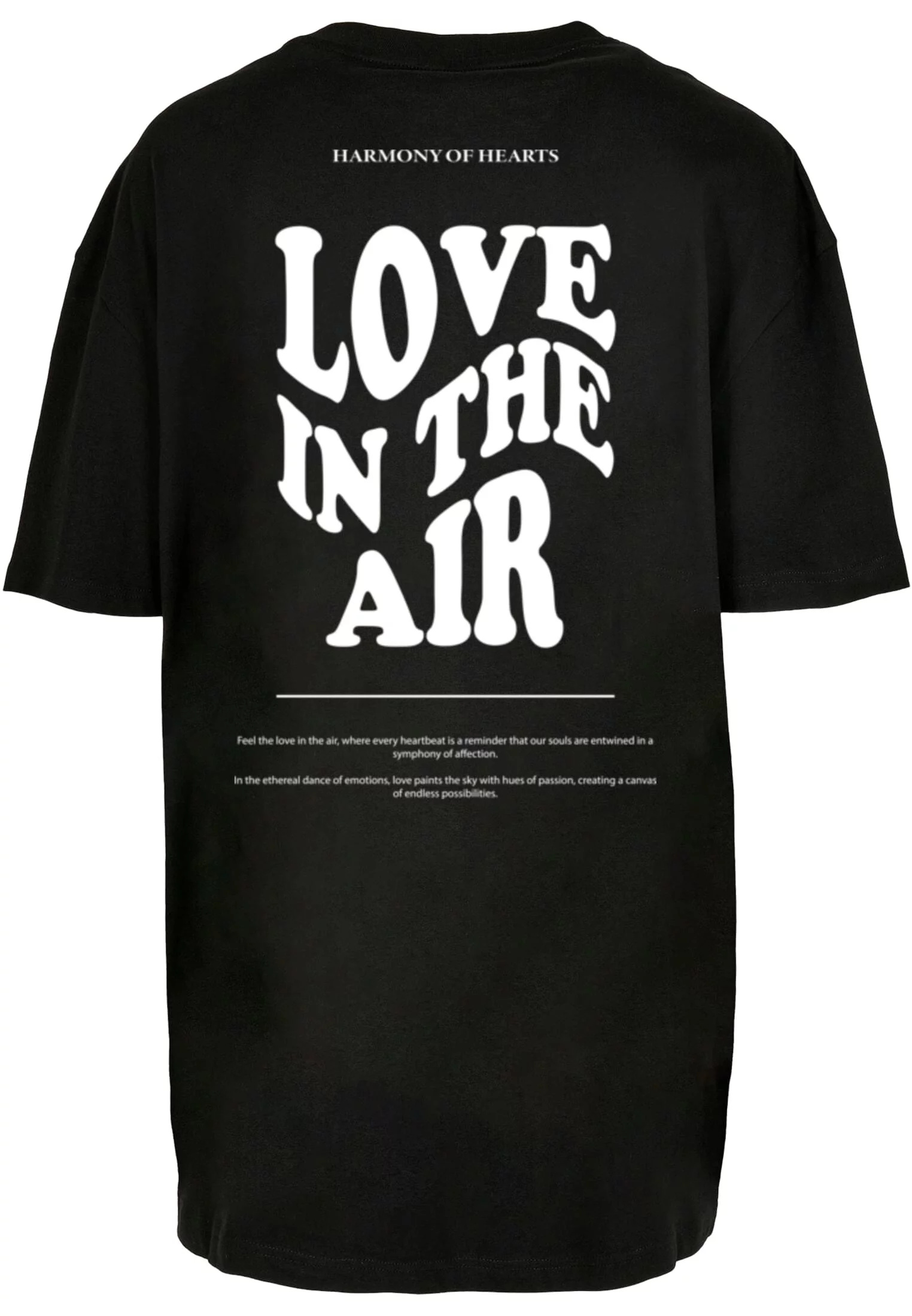 Na zadní straně trička se nachází výrazný nápis "LOVE IN THE AIR" v retro stylu, doplněný o citát, který podporuje téma lásky a emocí. Tento nápis je doplněn menším textem, který přidává tričku filozofický rozměr, zdůrazňující, že láska je všudypřítomná a neomezená. Nad tímto nápisem je menším písmem napsáno "HARMONY OF HEARTS", což posiluje celkový dojem harmonie a souznění.