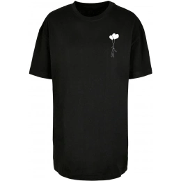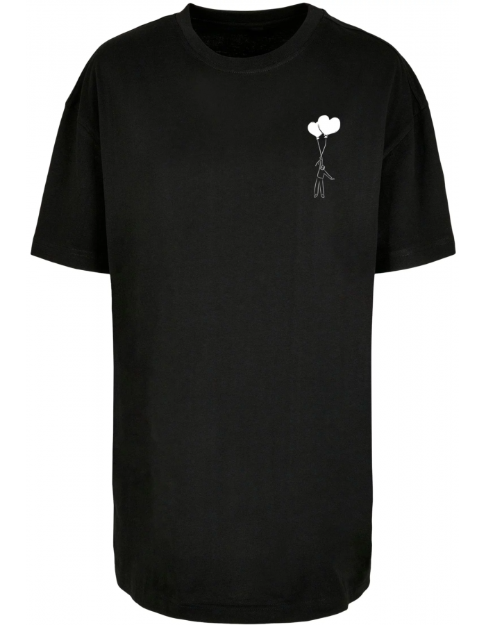 Toto tričko s krátkými rukávy je designově jednoduché, ale s výrazným grafickým prvkem na přední a zadní straně. Na přední straně, na levé hrudi, je malá grafika znázorňující postavu držící dvě srdíčka ve tvaru balónků, což dodává tričku jemný a romantický nádech.