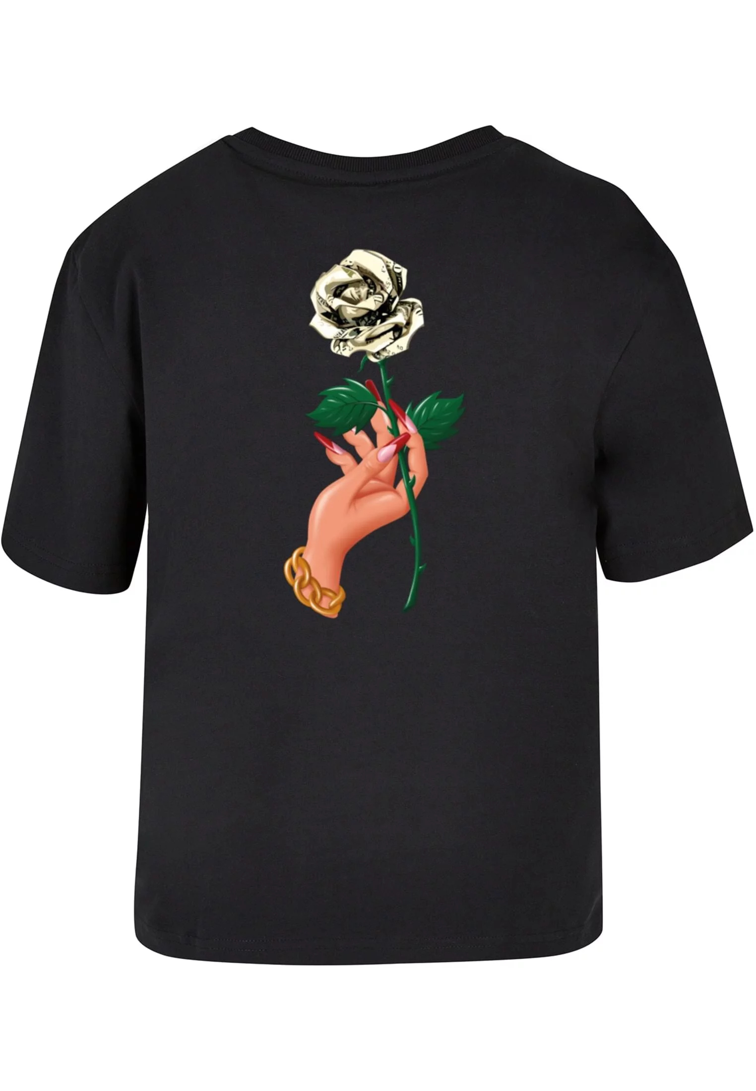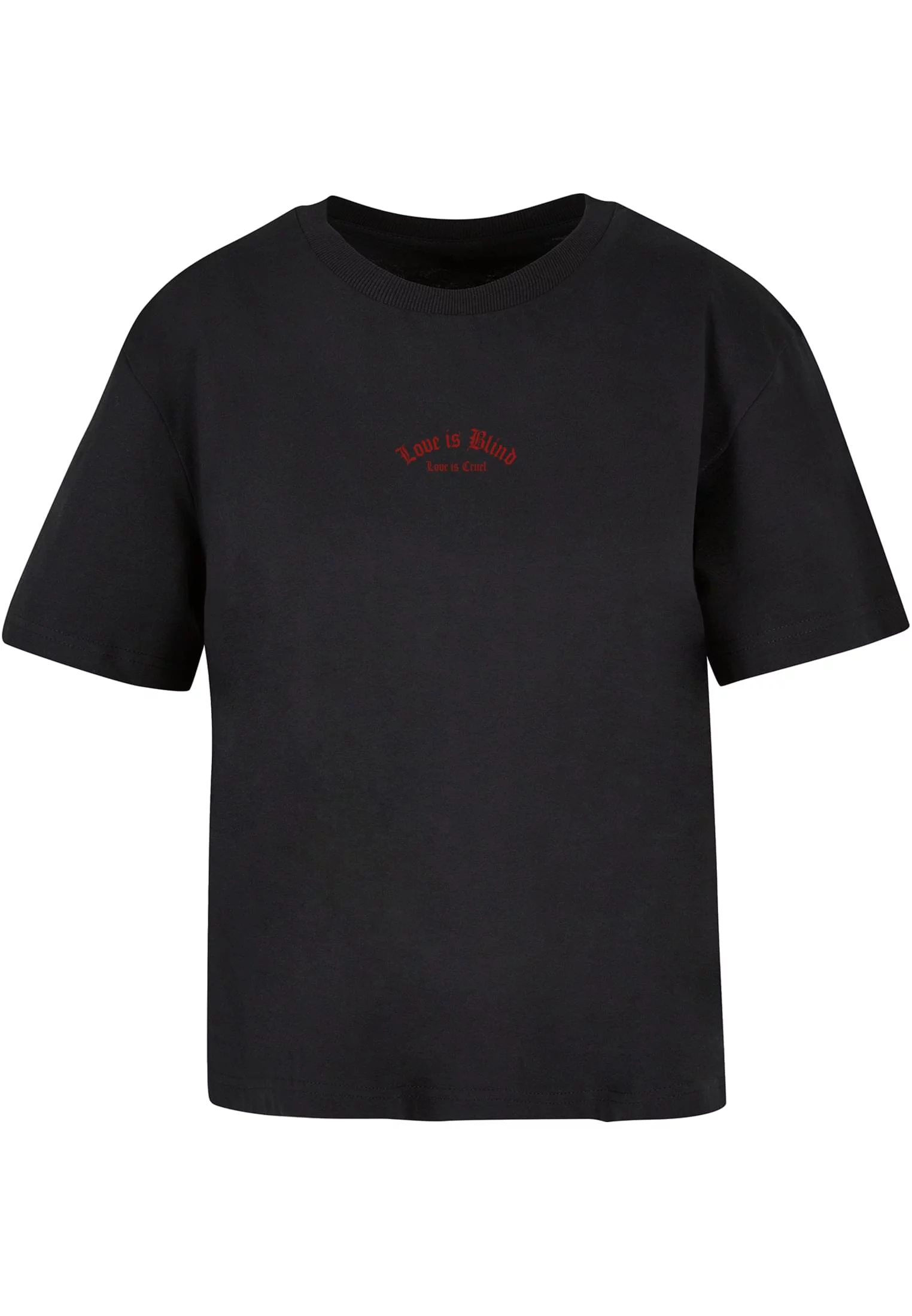 Toto černé tričko má krátké rukávy a klasický střih. Na přední straně, v oblasti hrudníku, je červený nápis „Love is Blind“ a pod ním menším písmem „Love is Cruel“. Na zadní straně je výrazná grafika znázorňující ruku s dlouhými, červeně nalakovanými nehty, která drží růži vyrobenou z bankovek. Ruka má na zápěstí zlatý náramek. Design trička působí moderně a stylově, s kombinací jemného nápisu na přední straně a poutavé grafiky na zádech.