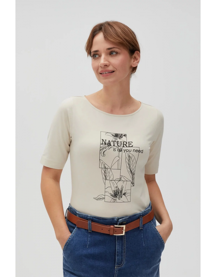 95% BAVLNA, 5% ELASTAN Béžová halenka je perfektní volbou pro každou ženu, která si cení pohodlí a stylu. Hladká halenka s potiskem, vyrobená z kvalitní bavlny, působí velmi elegantně. Díky krátkým rukávům a vypasovanému střihu se skvěle hodí jak pro každodenní nošení, tak pro speciální příležitosti. Lodkový výstřih dodává halence lehkost a ženský půvab. Tričko se skvěle hodí na setkání s přáteli, do práce nebo na romantické rande. Hodí se také k mnoha dalším šatníkům, jako jsou džíny, sukně a šortky. Díky univerzálnímu designu si můžete vytvořit mnoho různých stylů a přizpůsobit halenku svému individuálnímu vkusu.