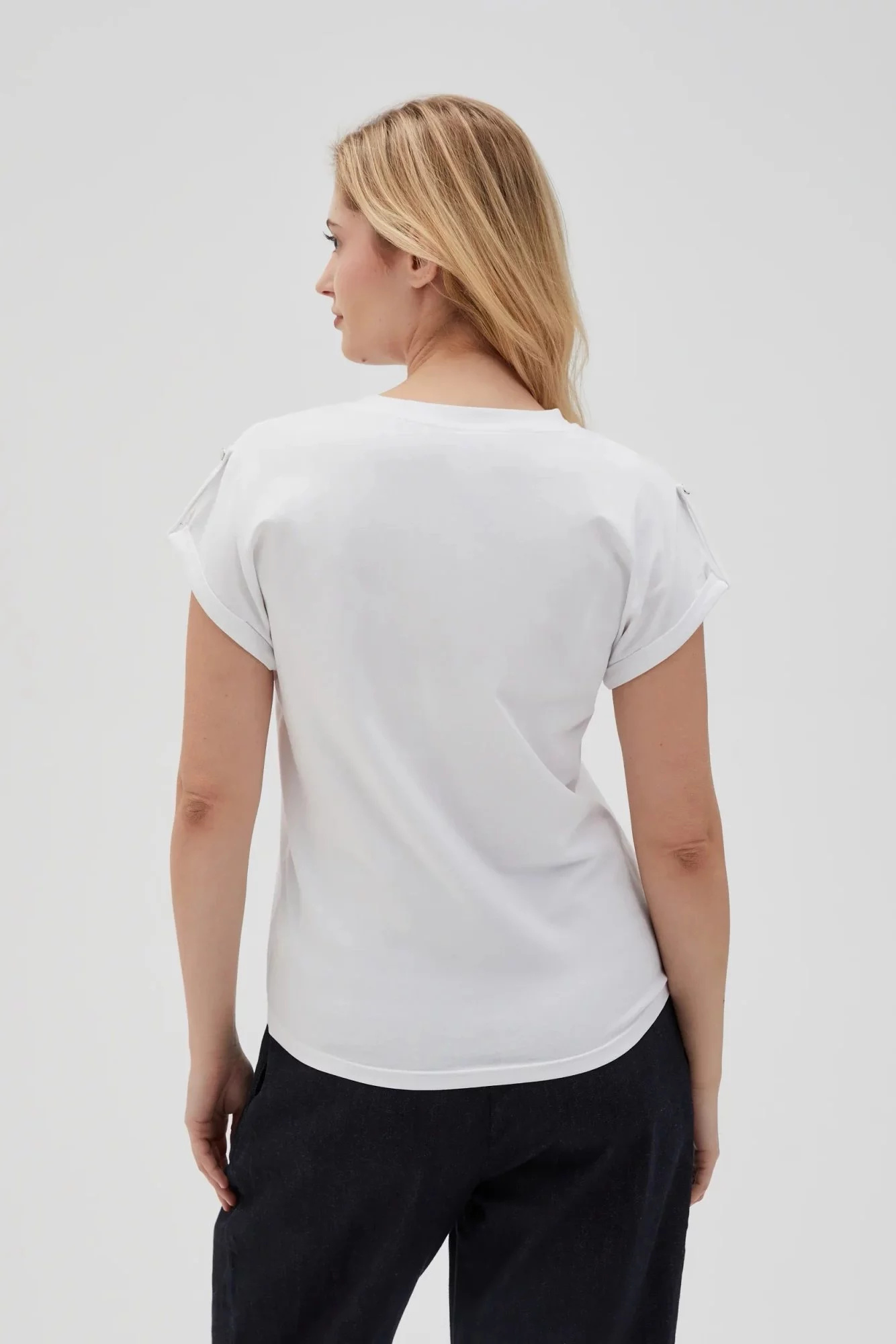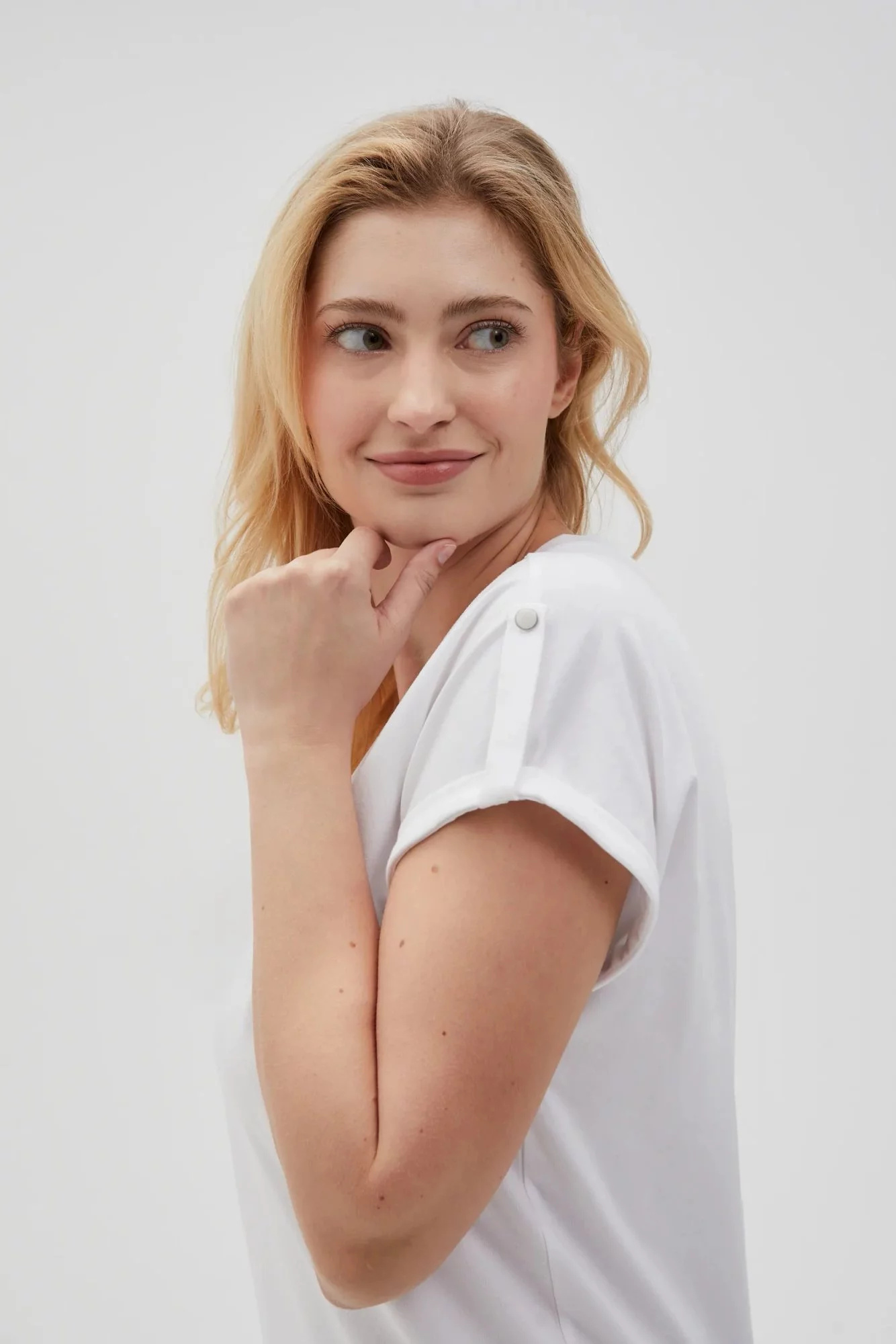 95% BAVLNA, 5% ELASTAN Modré tričko je perfektní nabídkou pro ženy, které oceňují pohodlí a jednoduchost. Vyrobeno z měkké bavlny, bez vzoru, hladké na dotek. Krátké rukávy a výstřih do V dodávají halence lehký a ležérní charakter. Volný střih zajišťuje pohodlí a dokonale se přizpůsobí siluetě. Ideální pro každodenní použití, do práce nebo na procházku. Skvěle poslouží jako základ pro mnoho stylů - lze jej kombinovat s džínami, sukní nebo elegantními kalhotami. Vypadá skvěle jak samostatně, tak pod svetrem nebo bundou. Halenka je klíčovým prvkem šatníku každé ženy a zajišťuje pohodlí a styl v každé situaci.