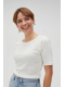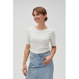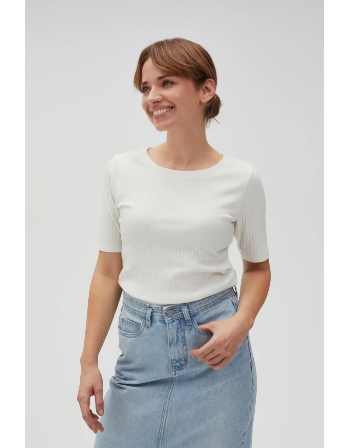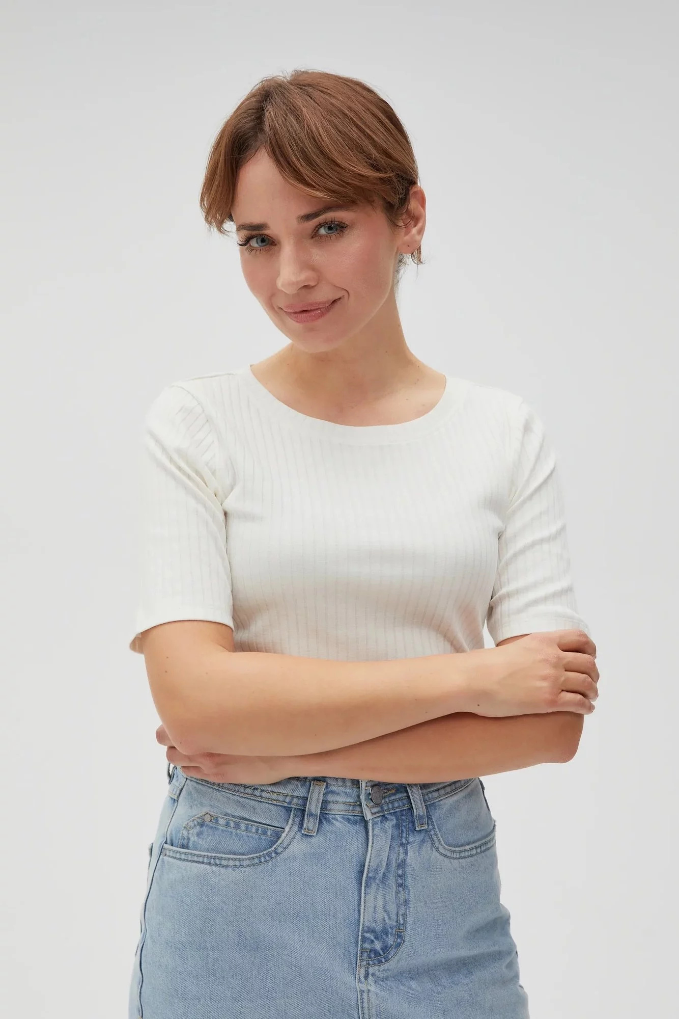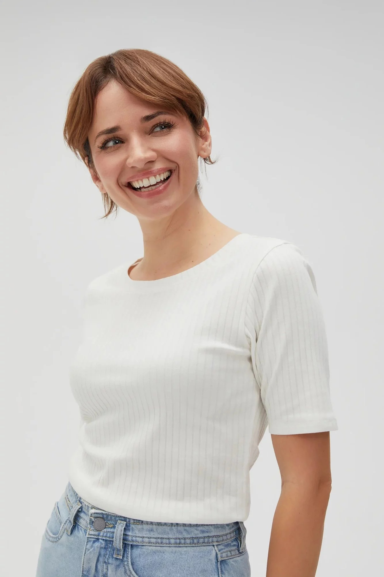 SKŁAD MATERIAŁOWY: 95% BAWEŁNA, 5% ELASTAN Kremowa bluzka to idealne rozwiązanie dla każdej kobiety, która ceni sobie wygodę i styl. Wykonana z wysokiej jakości bawełny w strukturalnym rib wzorze, zapewnia komfort noszenia i doskonałe dopasowanie do sylwetki. Krótki rękaw oraz okrągły dekolt sprawiają, że bluzka jest niezwykle uniwersalna i pasuje do wielu stylizacji. Ta kremowa bluzka doskonale sprawdzi się na wiele różnych okazji - zarówno na co dzień, do pracy, jak i na wieczorne wyjścia. Można ją zestawić zarówno z jeansami, spódniczką, jak i eleganckimi spodniami. Dzięki swojemu klasycznemu designowi, będzie doskonałym uzupełnieniem każdej damskiej garderoby.