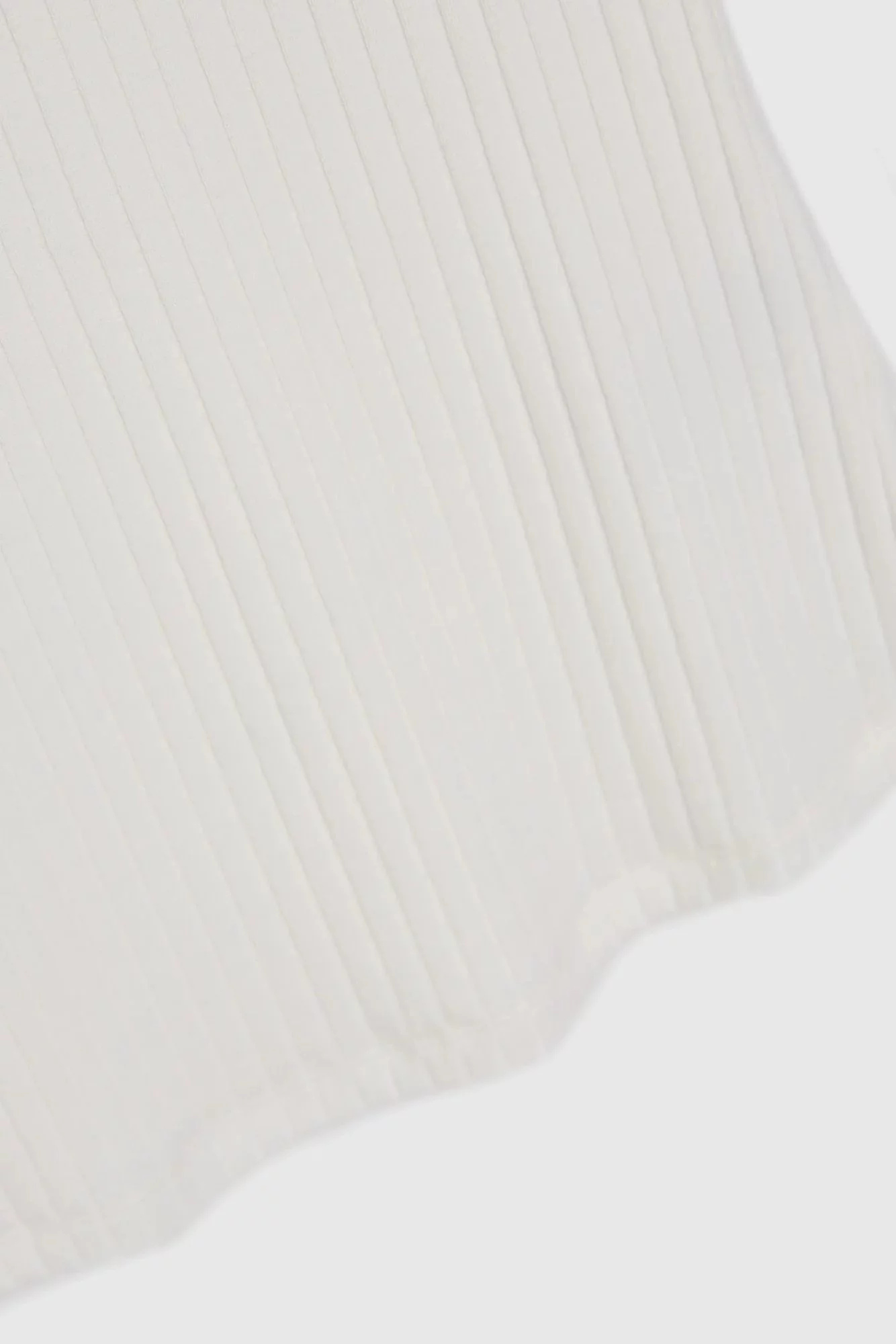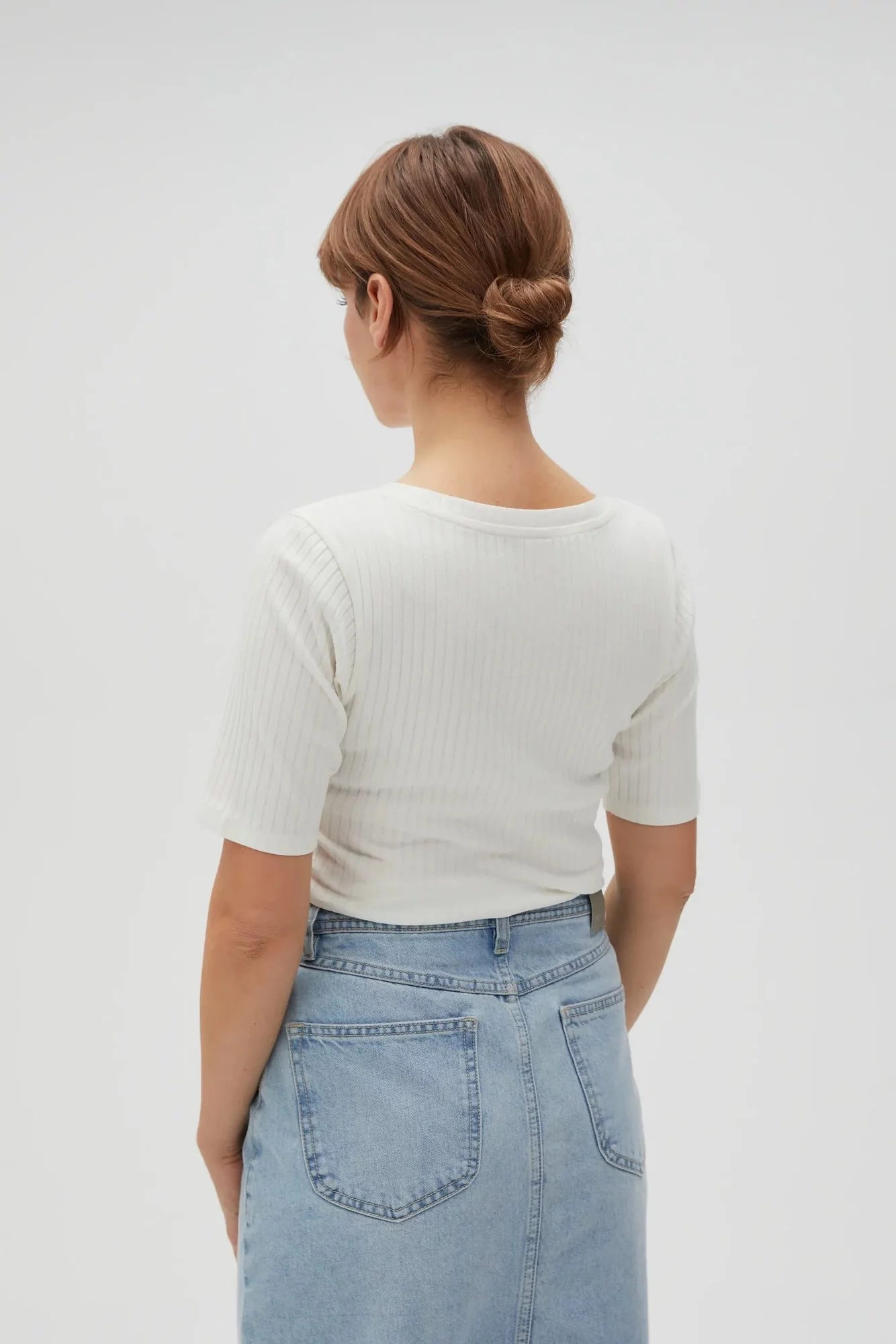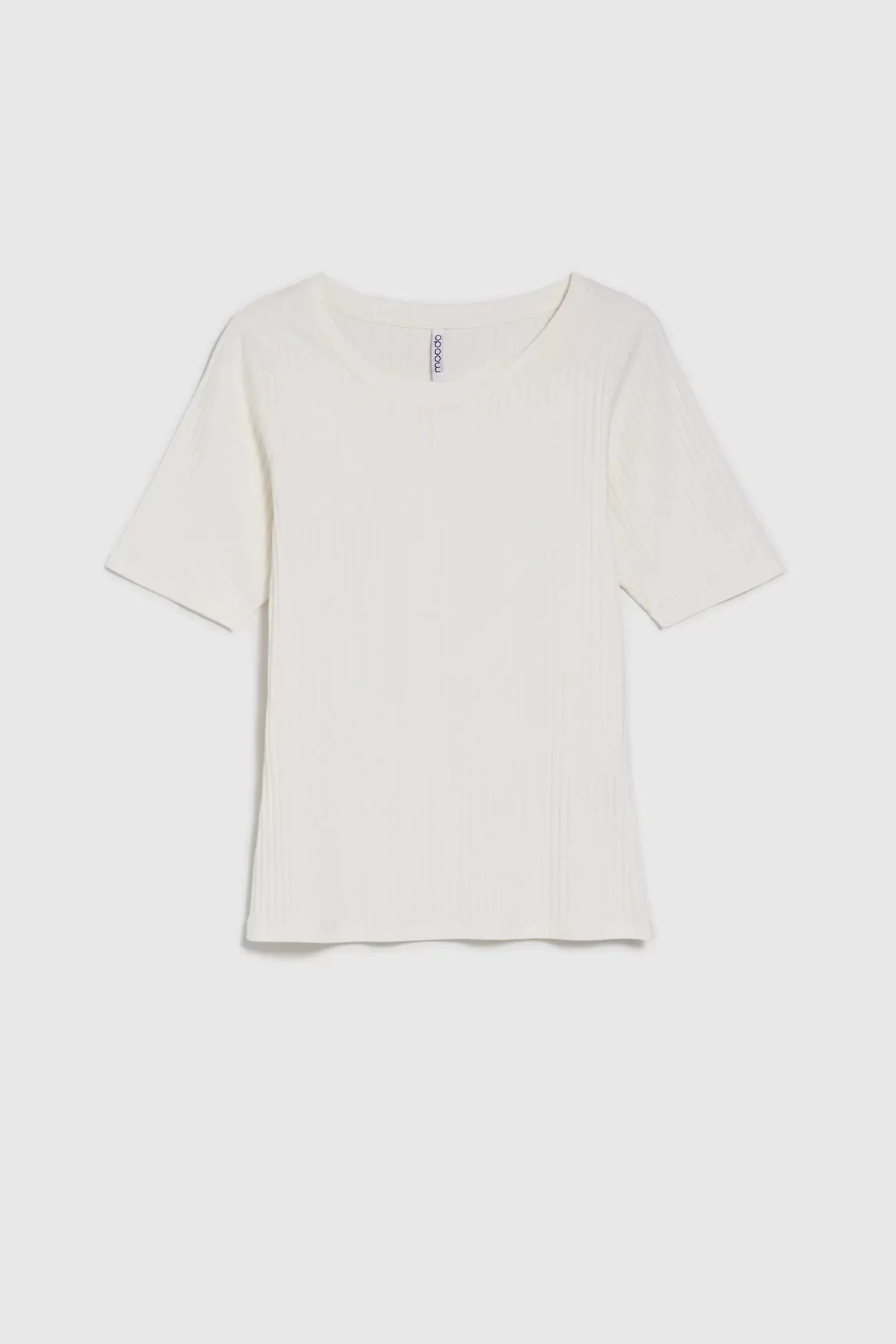 SKŁAD MATERIAŁOWY: 95% BAWEŁNA, 5% ELASTAN Kremowa bluzka to idealne rozwiązanie dla każdej kobiety, która ceni sobie wygodę i styl. Wykonana z wysokiej jakości bawełny w strukturalnym rib wzorze, zapewnia komfort noszenia i doskonałe dopasowanie do sylwetki. Krótki rękaw oraz okrągły dekolt sprawiają, że bluzka jest niezwykle uniwersalna i pasuje do wielu stylizacji. Ta kremowa bluzka doskonale sprawdzi się na wiele różnych okazji - zarówno na co dzień, do pracy, jak i na wieczorne wyjścia. Można ją zestawić zarówno z jeansami, spódniczką, jak i eleganckimi spodniami. Dzięki swojemu klasycznemu designowi, będzie doskonałym uzupełnieniem każdej damskiej garderoby.