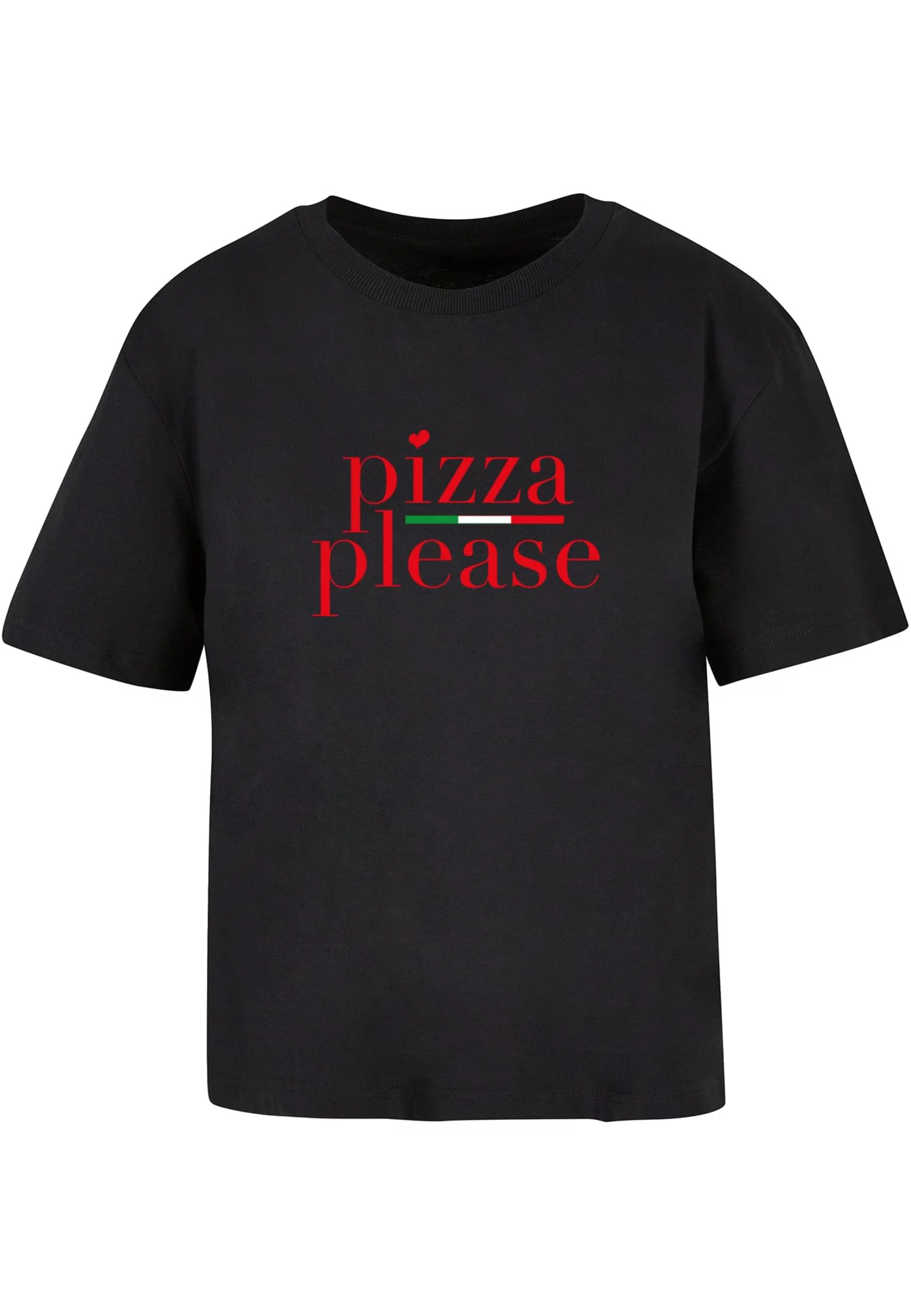 Tričko s jednoduchým, ale výrazným designem. Na přední straně trička je červený nápis „pizza please“, přičemž místo tečky nad písmenem „i“ je malé srdíčko, což dodává celkovému designu hravý a vtipný nádech. Pod slovem „pizza“ je zelený a bílý proužek, které spolu s červeným textem odkazují na barvy italské vlajky, což zjevně souvisí s italskou pizzou.