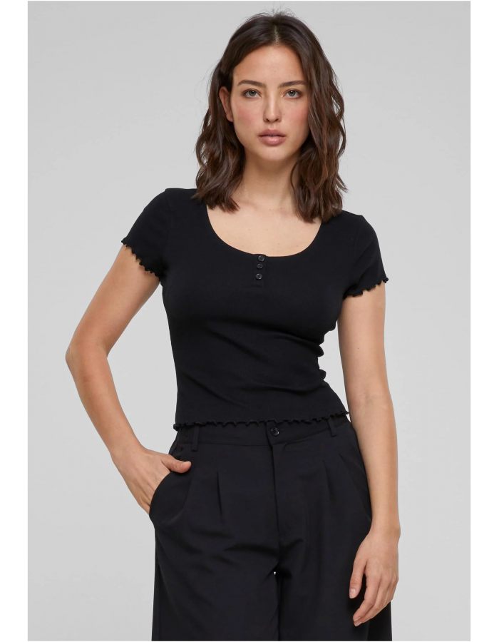Tento typ trička je oblíbený pro svůj přiléhavý střih a detaily, které dodávají jednoduchému designu zajímavý vzhled. Je vyrobeno z žebrované (ribbed) látky, která je pružná a pohodlná. Tento materiál dobře obepíná tělo a přizpůsobuje se tvaru postavy, což zvýrazňuje ženskou siluetu. Na okrajích rukávů a v pase má jemně zvlněný efekt, což dodává tričku něžný a ženský vzhled.