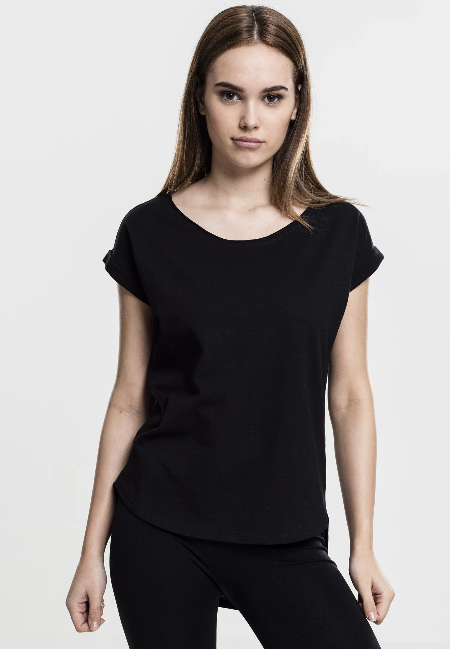 Široký kulatý výstřih, vyhrnuté otvory na rukávech a delší záda propůjčují ležérnímu stylu. Legíny jsou perfektními komponenty pro dámské tričko s dlouhým zády Shaped Slub od URBAN CLASSICS.