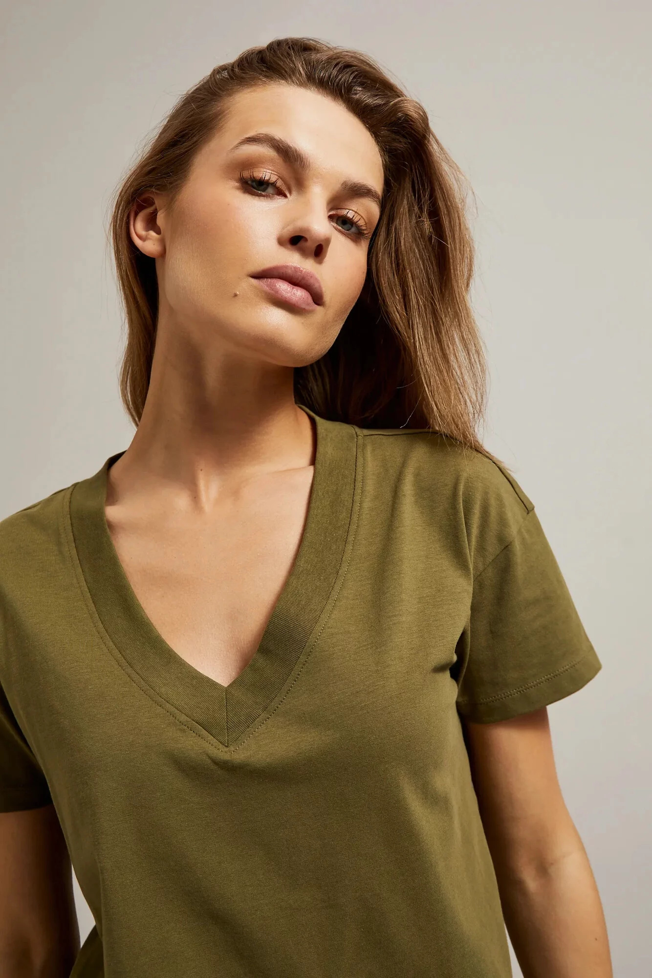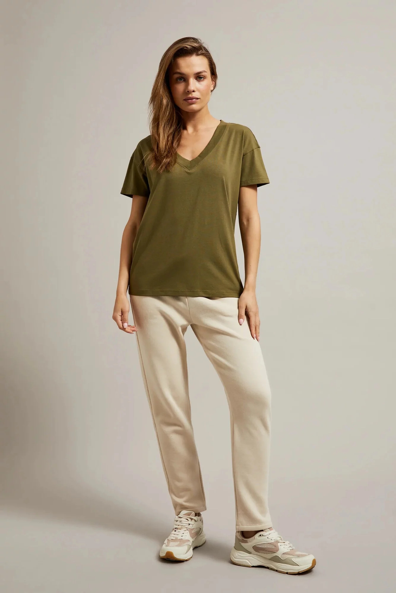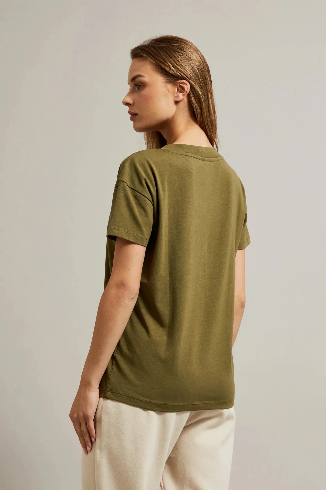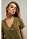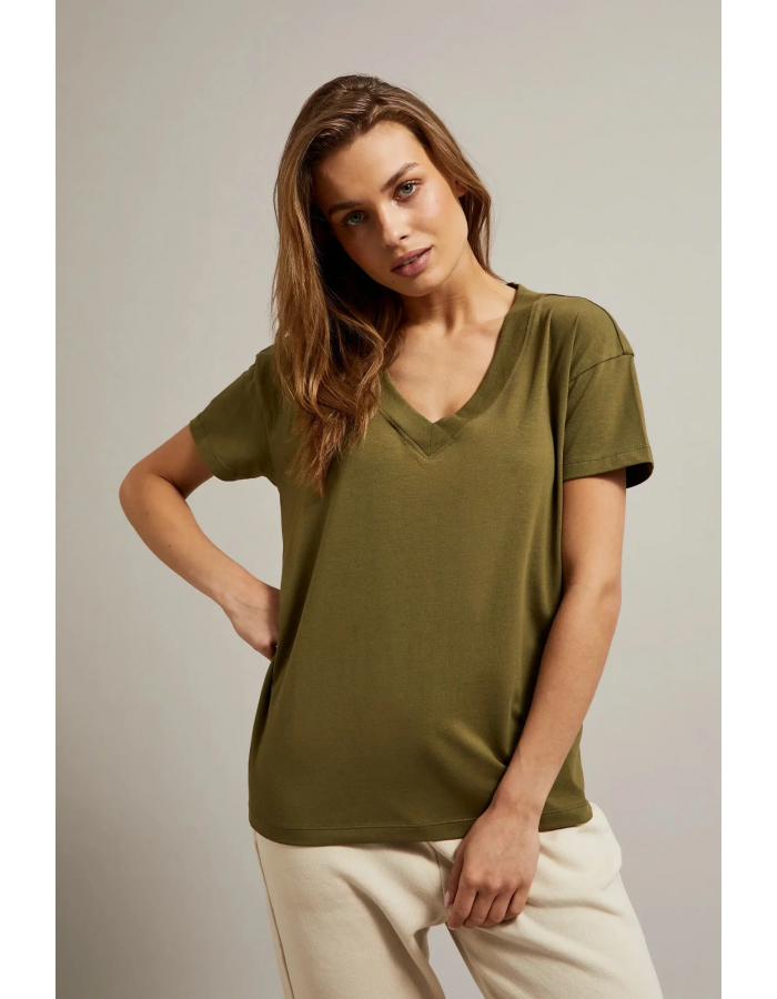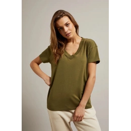 95%BAVLNA, 5%ELASTAN Blůza v olivové barvě je ideální volbou pro každou ženu, která si cení pohodlí a stylu. Vyrobená z vysoce kvalitní bavlny, hladká a bez vzoru, zajišťuje pohodlí při nošení. Krátký rukáv a výstřih do V dodávají halence lehkost a svěžest. Volný střih zdůrazňuje ženskou postavu, zároveň umožňuje volnost pohybu. Dokonalá volba na letní procházky, rande nebo setkání s přáteli. Dokonale se hodí jak k džínům, sukni, tak i k šortkám. Díky svému klasickému designu ji lze kombinovat jak s teniskami, tak s elegantními botami na podpatku. Nezávisle na příležitosti, tato halenka bude ideálním doplněním Tvého šatníku.