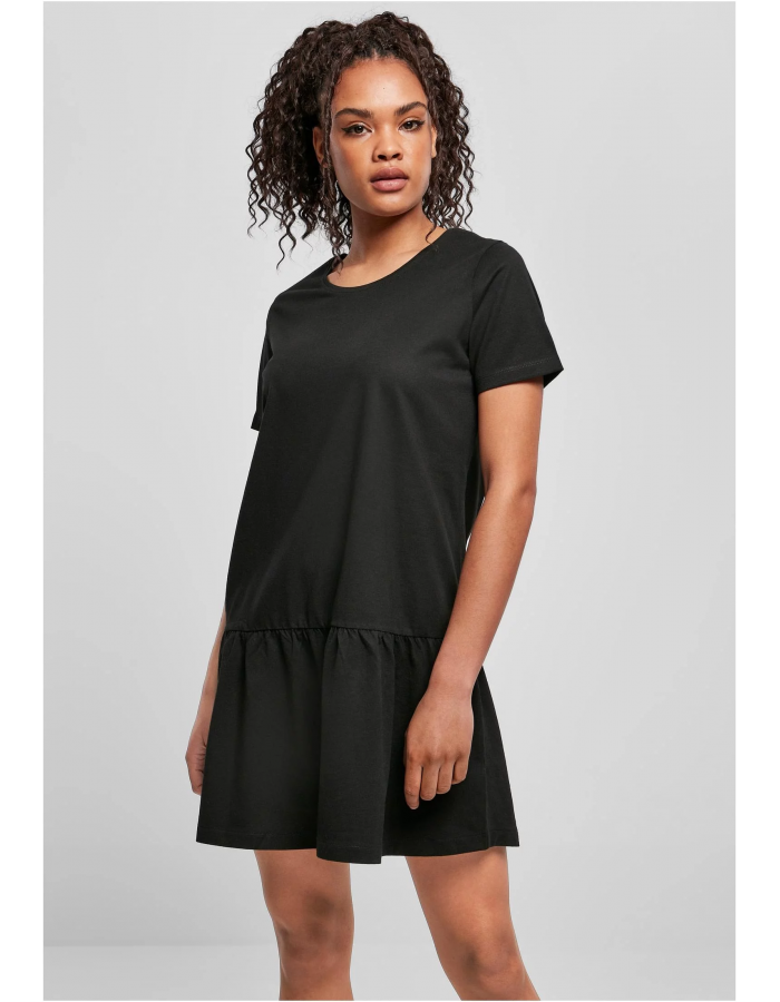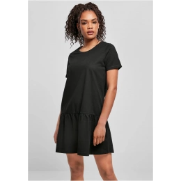 Široký střih a jednoduchý, ale efektní design tohoto dámského trička vypadá úžasně žensky. Krátké rukávy, volný střih i hluboký kulatý výstřih připomínají tvarem vyhlášeného trička. Volantový přístup sukně vytváří jemný akcent. Stejně snadný jako střih je materiál dámských šatů, který se skládá z hladkého single jersey.