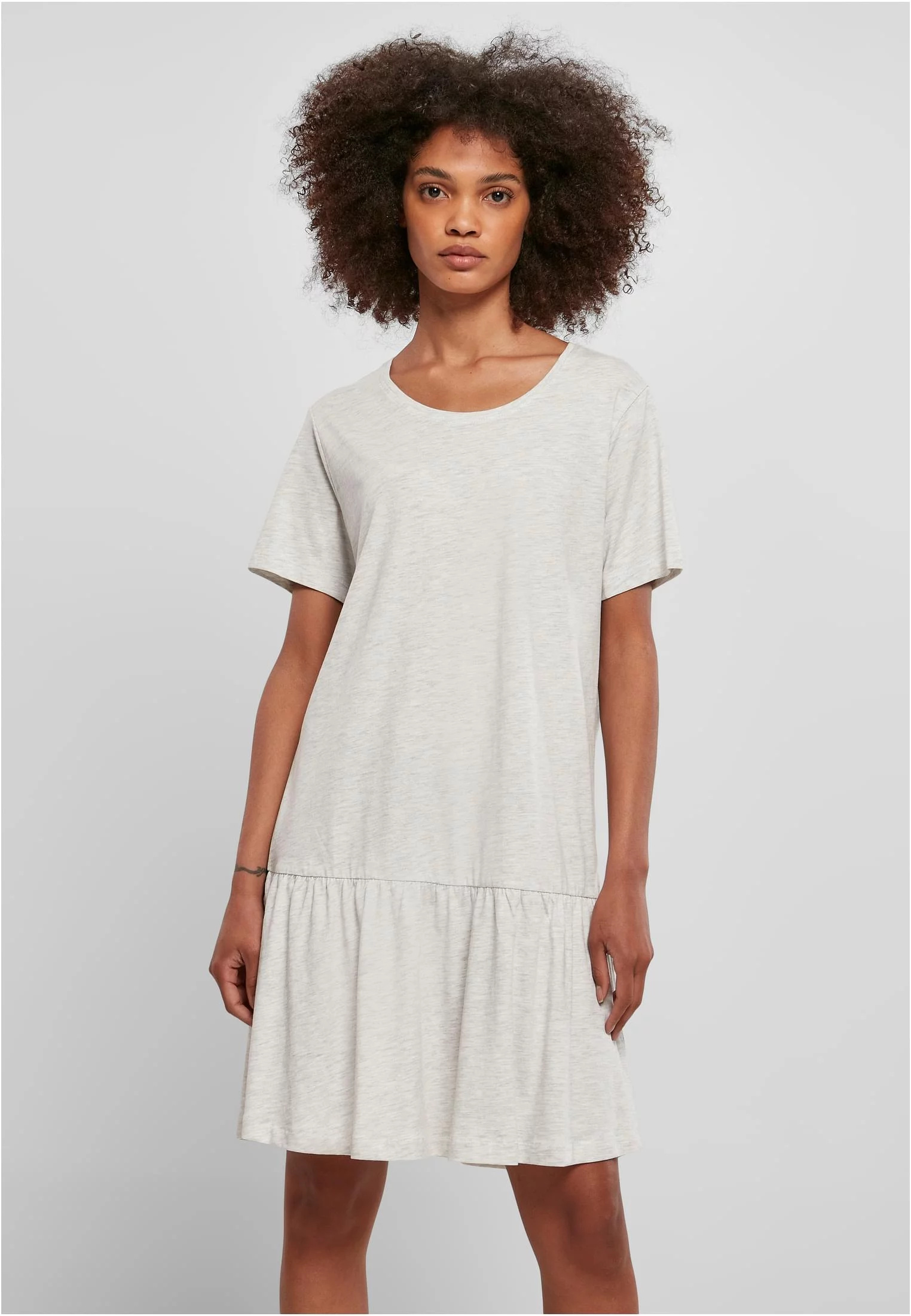 Široký střih a jednoduchý, ale efektní design tohoto dámského trička vypadá úžasně žensky. Krátké rukávy, volný střih i hluboký kulatý výstřih připomínají tvarem vyhlášeného trička. Volantový přístup sukně vytváří jemný akcent. Stejně snadný jako střih je materiál dámských šatů, který se skládá z hladkého single jersey.