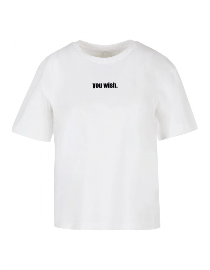 Toto tričko s krátkými rukávy má jednoduchý design s černým nápisem „you wish.“ na přední straně. Tričko má klasický střih s kulatým výstřihem, což zajišťuje pohodlí a volnost při nošení. Tento minimalistický a lehce provokativní nápis dodává tričku moderní a sebevědomý nádech, ideální pro ty, kteří chtějí vyjádřit svůj postoj s dávkou sarkasmu.