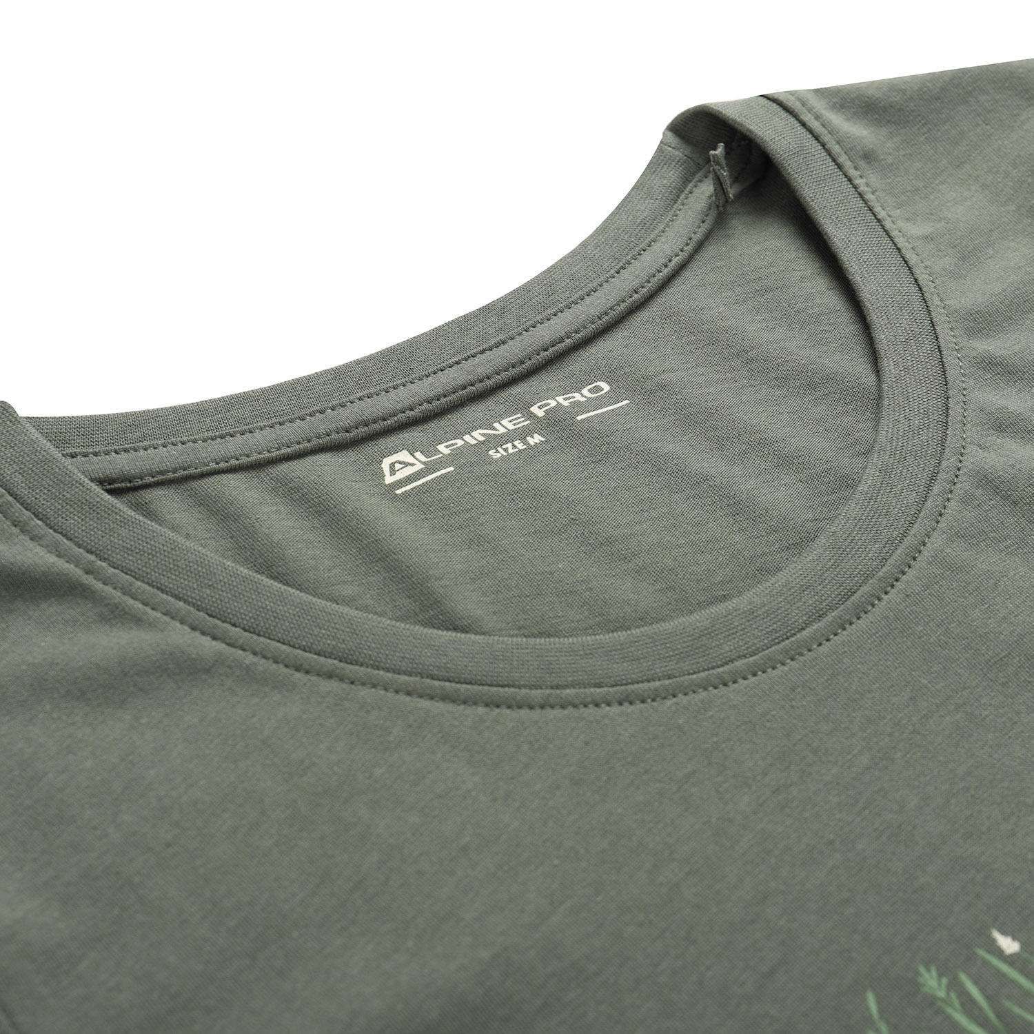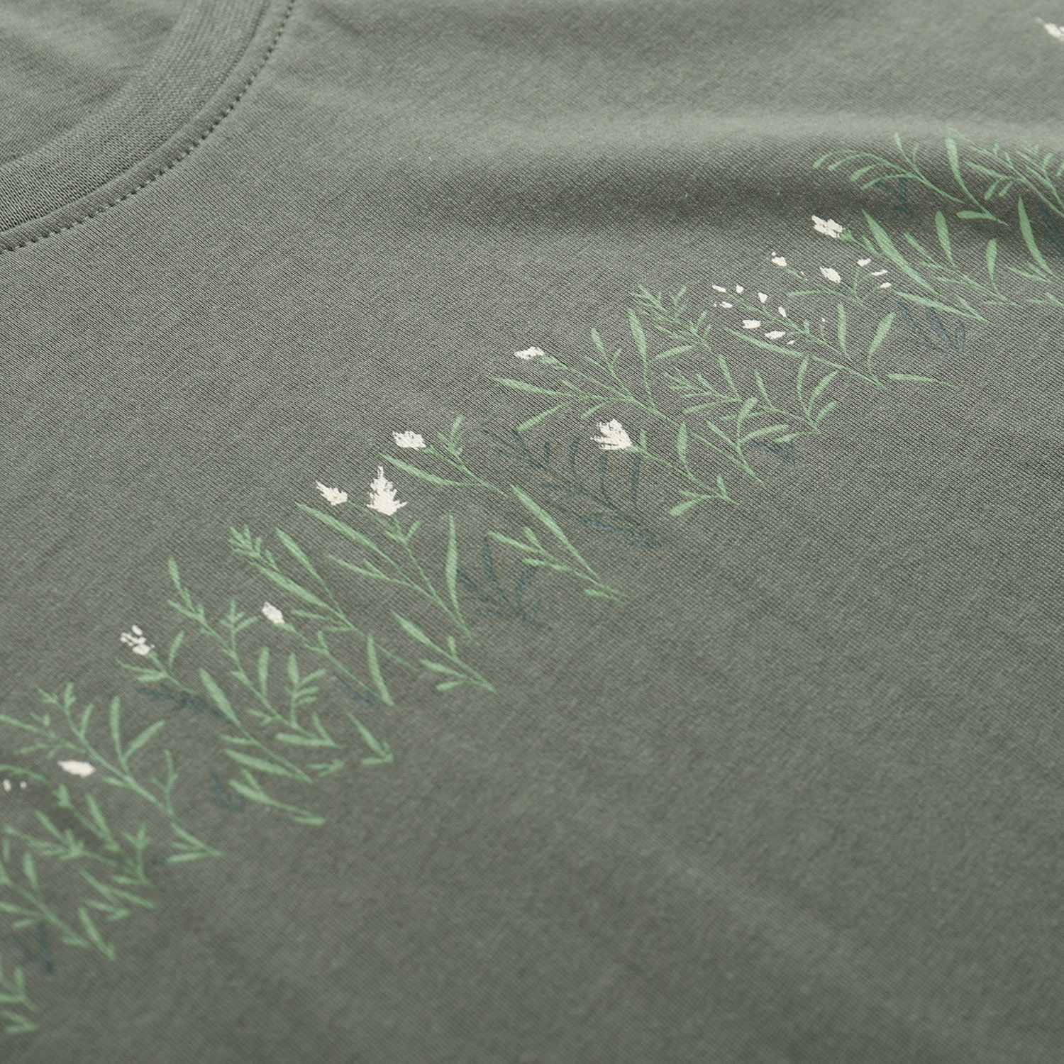 Polopřiléhavý střih lichotí postavě a zároveň poskytuje dostatek volnosti pro celodenní pohodlné nošení. Přední díl zdobí ECO potisk vyrobený technologií šetrnější k přírodě, což ještě více podtrhuje udržitelný charakter tohoto modelu. V bočním švu se nachází decentní nášivka, která dodává tričku originální detail.