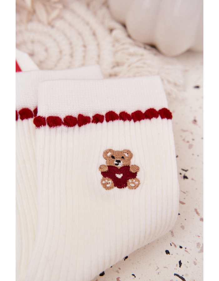 Veselé dámské vánoční ponožky v bílé barvě s motivem medvídka přinášejí hravý a sváteční vzhled. Vyrobené z měkkého a pružného materiálu, poskytují pohodlí po celý den. Ideální pro domácí pohodu, vánoční oslavy nebo jako originální dárek pro ženy.
