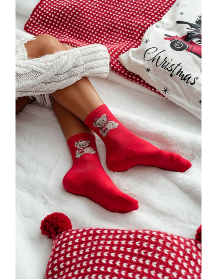 Měkké a hřejivé dámské vánoční ponožky v červené barvě s motivem medvídka v čepici Santa. Pohodlné a příjemné na nošení, ideální pro zimní období a vytvoření sváteční atmosféry doma.