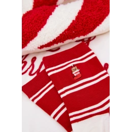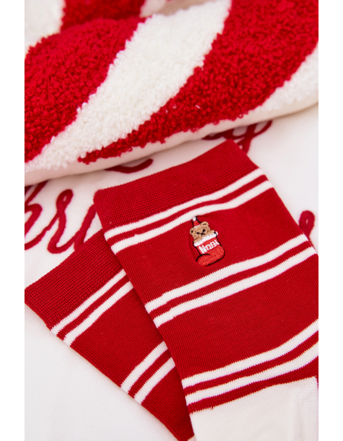 Hřejivé dámské vánoční ponožky v červené barvě s kombinací pruhů a roztomilého motivu medvídka. Vyrobené z měkké směsi s vlnou, která zajišťuje tepelný komfort a příjemný pocit při nošení. Ideální pro zimní období a vánoční atmosféru doma i do bot.