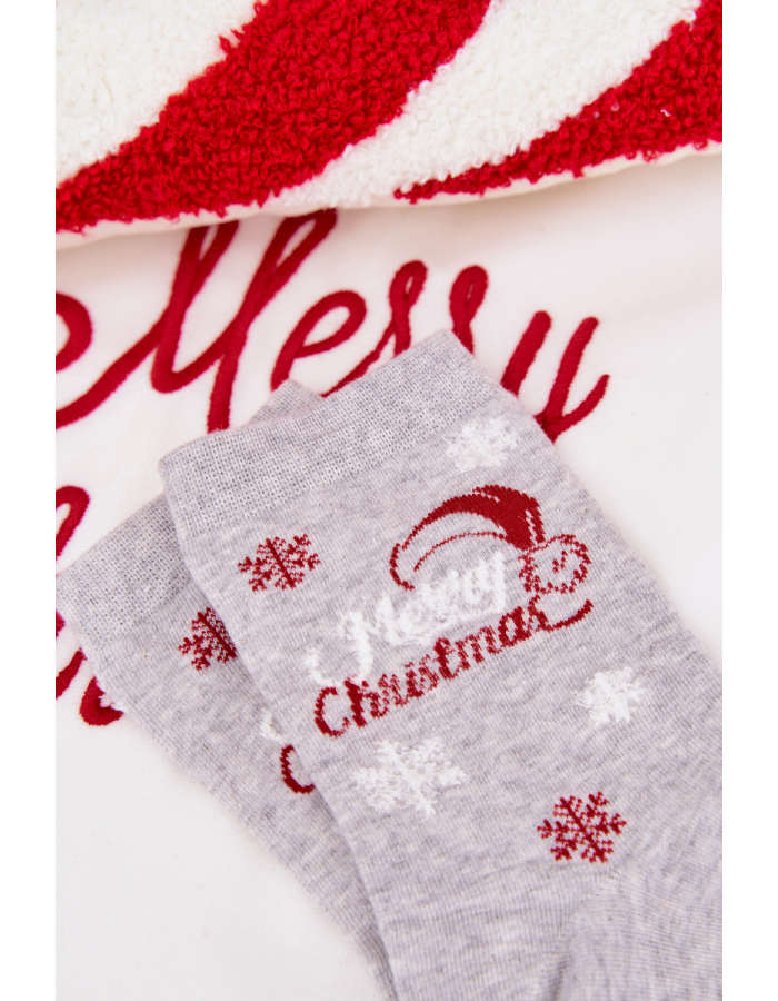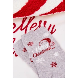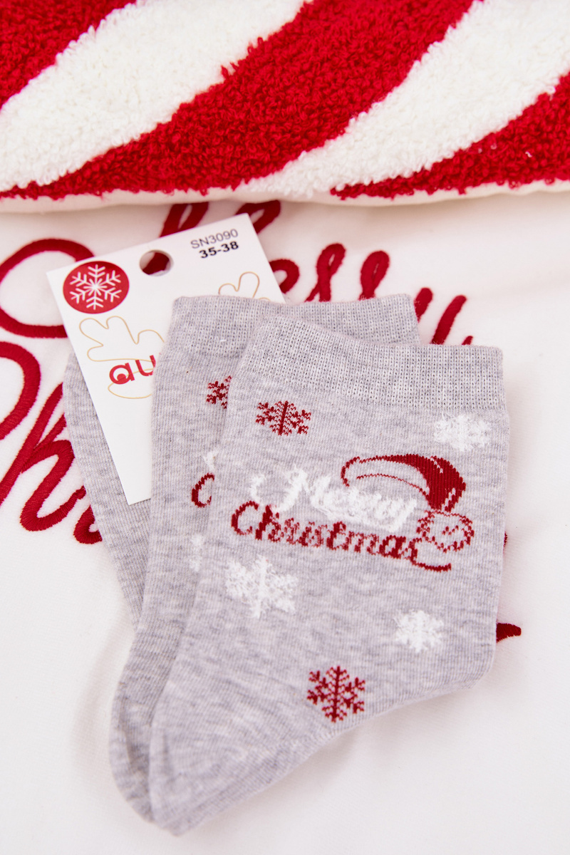 Hřejivé dámské vánoční ponožky v světle šedém odstínu se vzorem sněhových vloček a dekoračním nápisem. Vyrobené z měkké směsi s podílem vlny, která zajišťuje tepelný komfort a příjemný pocit při nošení. Perfektní volba pro zimní období a vánoční atmosféru doma i venku.