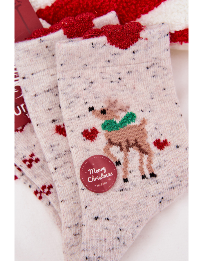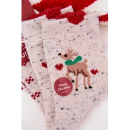Hřejivé dámské vánoční ponožky v jemně šedém odstínu se vzorem soba a drobných srdíček. Vyrobené z měkké směsi s podílem alpaky, která poskytuje tepelný komfort, měkkost a pohodlí při nošení. Ideální pro zimní období a vánoční atmosféru doma i venku.