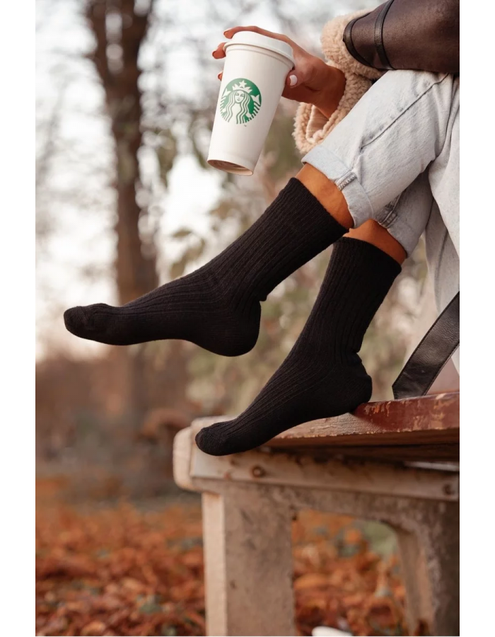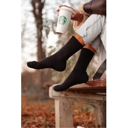 Teplé dámské ponožky v černé barvě z měkké vlněné směsi. Hřejivý materiál poskytuje pohodlí a tepelnou izolaci, ideální pro chladné počasí a domácí i venkovní nošení.