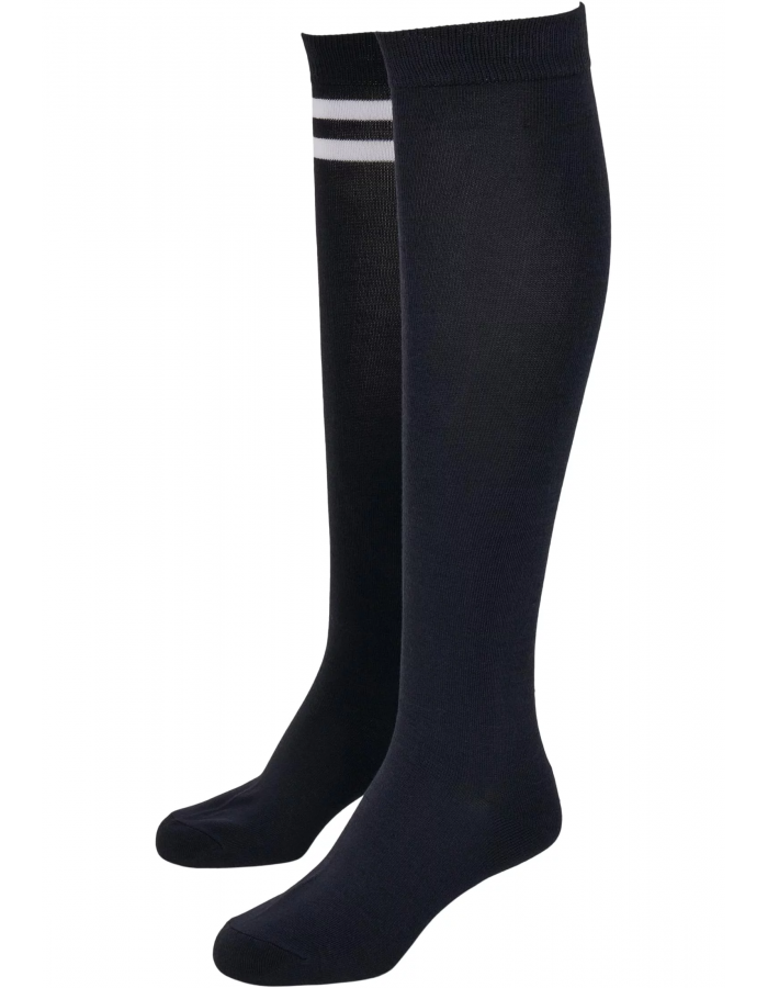 Dámské ponožky nabízejí super sportovní vysokoškolský styl: jednobarevné s bílými dvojitými pruhy pod elastickými manžetami a střihu s pohodlnou délkou ke kolenům. Představují se v praktické sadě po dvou a jsou k dispozici ve dvou různých velikostech. Ponožky jsou vyrobeny ze spolehlivého polyesteru.
