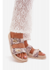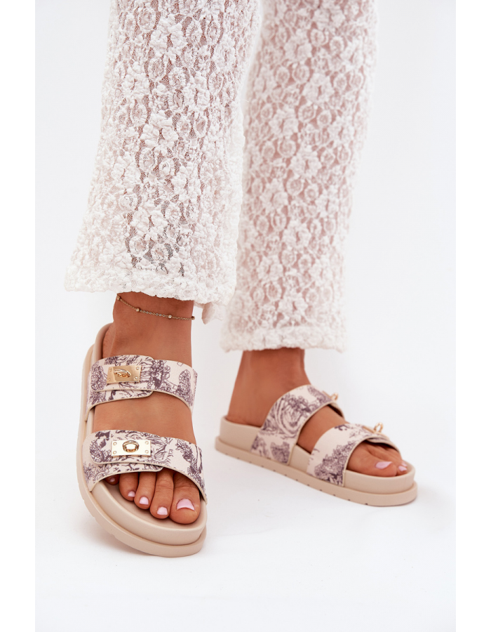 Béžové vzorované pantofle krásně doplní neutrální outfity – zkombinujte je s bílé, krémové nebo denimové kousky pro svěží letní styling.