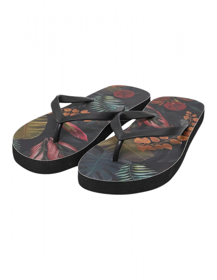 Tyto stylové žabky s tropickým vzorem jsou ideální volbou pro letní dny. Mají černé pásky a podrážku s barevným potiskem tropických listů v odstínech zelené, červené a oranžové. Díky svému designu skvěle doplní každý letní outfit, ať už se chystáte na pláž, bazén nebo jen procházku po městě. Pružná a pohodlná konstrukce zajistí maximální komfort při nošení.