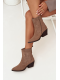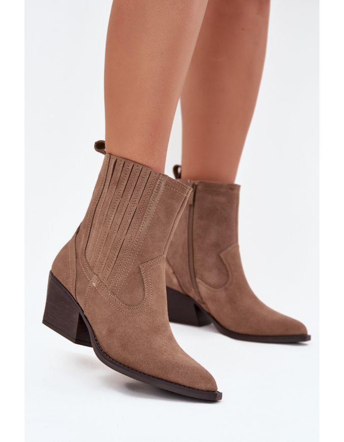 Stylové dámské kotníkové boty Dylira v khaki odstínu z měkkého semiš kombinují módní kovbojský vzhled s pohodlným širokým podpatkem. Zateplení zajišťuje teplo během chladných dní a tvarovaná horní část dodává botám trendy charakter.