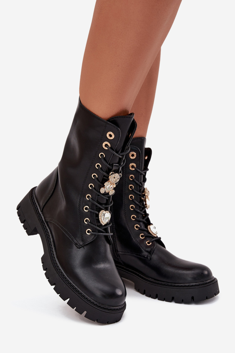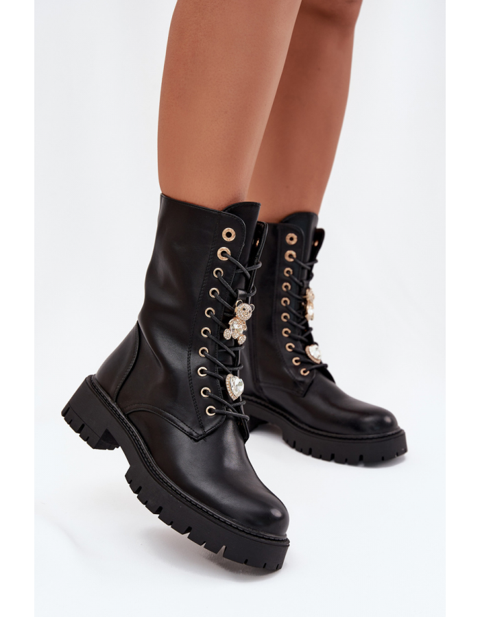 Vnitřek bot je zateplený obuvnickou vložkou, která zajišťuje teplo i v mrazivém počasí. Na šněrování jsou umístěny roztomilé připínky ve tvaru medvídka a srdíčka, které dodávají botám jedinečný, módní akcent.