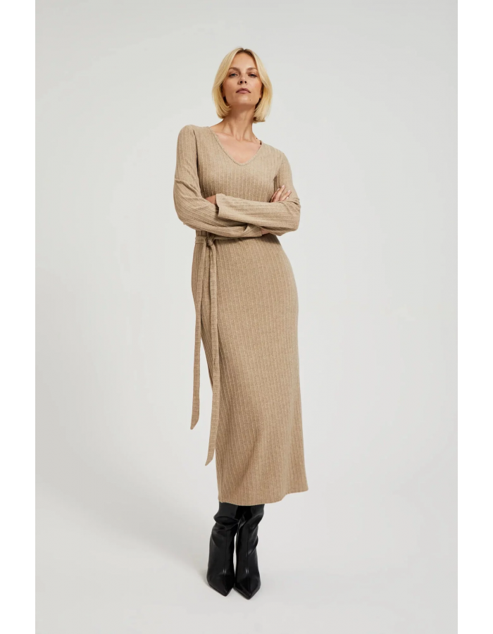 Má jednoduchý, klasický střih a pohodlný pásek, který zdůrazňuje pas. Materiál struktury způsobuje, že šaty vypadají velmi stylově, a jejich hladký povrch dodává eleganci. Ideální jak pro zvláštní příležitosti, tak pro každodenní nošení. Výstřih do V dodává půvab a jemně odhaluje krk. Dokonale se hodí jak do kanceláře, tak i na společenská setkání. Ideální nabídka pro ženy, které si cení klasiku s nádechem vytříbeného stylu.
