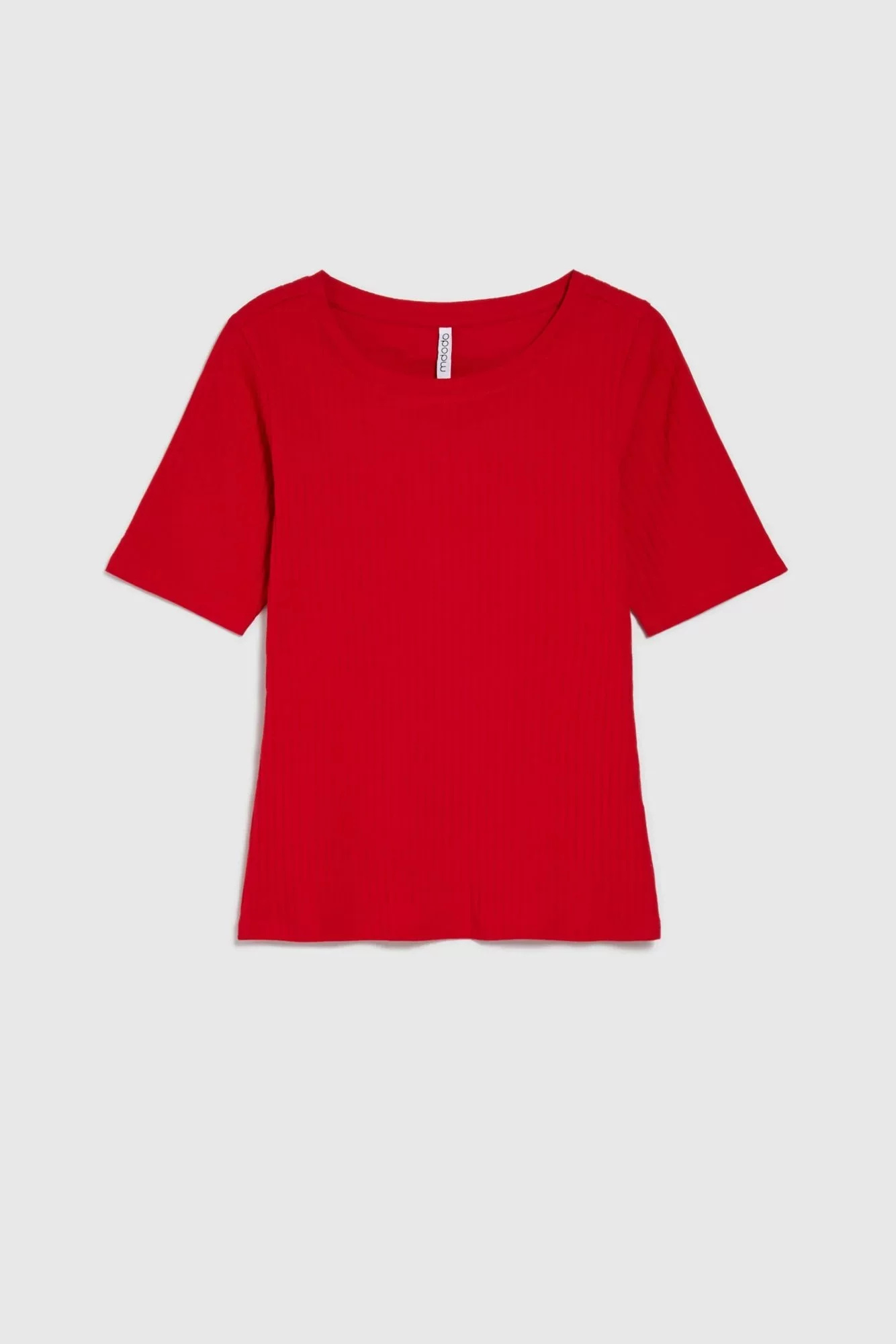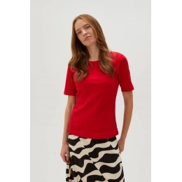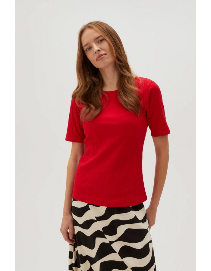SKŁAD MATERIAŁOWY: 95% BAWEŁNA, 5% ELASTAN Bluzka w kolorze czerwonym to idealna propozycja dla każdej kobiety, która ceni sobie wygodę i styl. Wykonana z wysokiej jakości bawełny, zapewniającej komfort noszenia oraz trwałość. Model z krótkim rękawem i okrągłym dekoltem doskonale podkreśla sylwetkę, sprawiając że każda kobieta poczuje się wyjątkowo. Idealna na wiele okazji, zarówno na co dzień jak i na spotkania ze znajomymi czy wyjścia do miasta. Świetnie komponuje się zarówno z jeansami, spódnicą jak i szortami, tworząc modny i wygodny outfit. Dzięki strukturalnemu materiałowi oraz dopasowanemu klasycznemu fasonowi, bluzka w kolorze czerwonym to must-have w szafie każdej kobiety, która stawia na wygodę i styl.