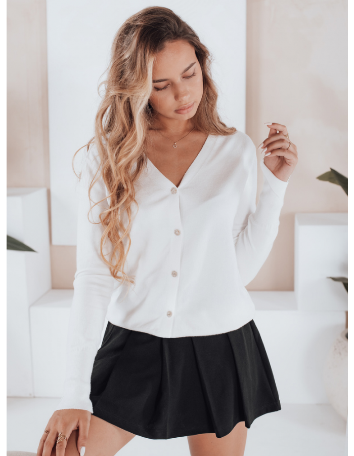 Uniwersalny kardigan o klasycznym kroju z dekoltem w serek i ozdobnymi guzikami to idealna baza do wielu stylizacji. Doskonale sprawdzi się zarówno na co dzień, jak i do bardziej eleganckich zestawów. Wysokiej jakości dzianina zapewnia komfort i swobodę ruchów.